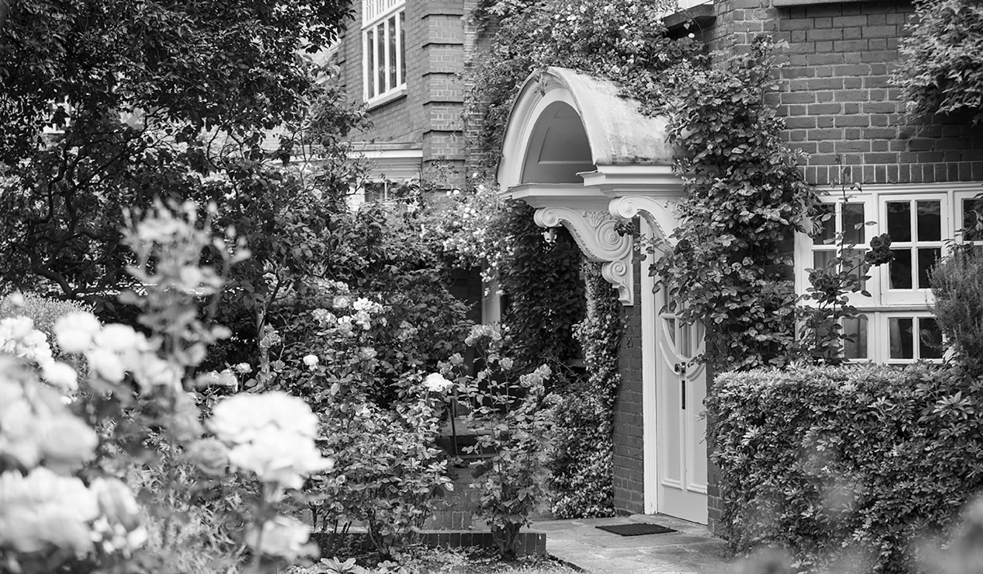 Le foglie si piegano come parole trattenute, la luce scivola sui bow windows come un ricordo che torna. All’interno, tra l’odore di legno, carta e incenso, sembra ancora possibile percepire il suono di un pensiero che passa da una stanza all’altra — una corrente d’aria che non vuole spegnersi.