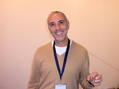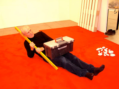 Passo oltre e mi fermo nello stand di  Massimo Minini,   dove domina invece il rosso del tappeto (pianta delllo studio) di Alberto Garruti e la scultura circolare a parete di Anish Kapoor. Minini,   scalzo,   mi chiede di aspettare un attimo che mi deve mostrare una cosa. Entra nello sgabuzzini e,   pochi secondo dopo esce con bolla e cassetta degli attrezzi in mano. Perplessa mi chiedo cosa mi deve mostrare. Penso che l’immagine qui sopra parli da sè. Veloce mi presto a immortalare quella che lo stesso Minini ha definito ‘La decima ora del gallersita’! Che sia un presagio di come andrà questa 17° edizione di Artissima?