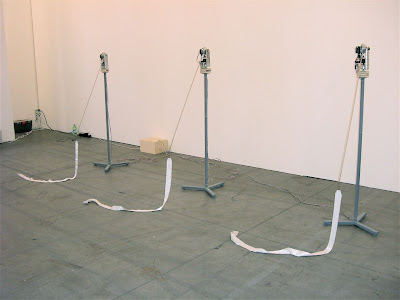Prove generali per le ‘ginnaste con nastro’ di Eva Marisaldi nello stand  s.a.l.e.s. Norbeto Ruggeri mi accoglie sorridente e soddisfatto dello stand. In effetti è molto elegante. Poche opere e ben orchestrate. Arienti,   Favelli,   Marisaldi,   Carocci. Manca all’appello solo Grazia Toderi: manca da appendere un suo stadio illuminato.