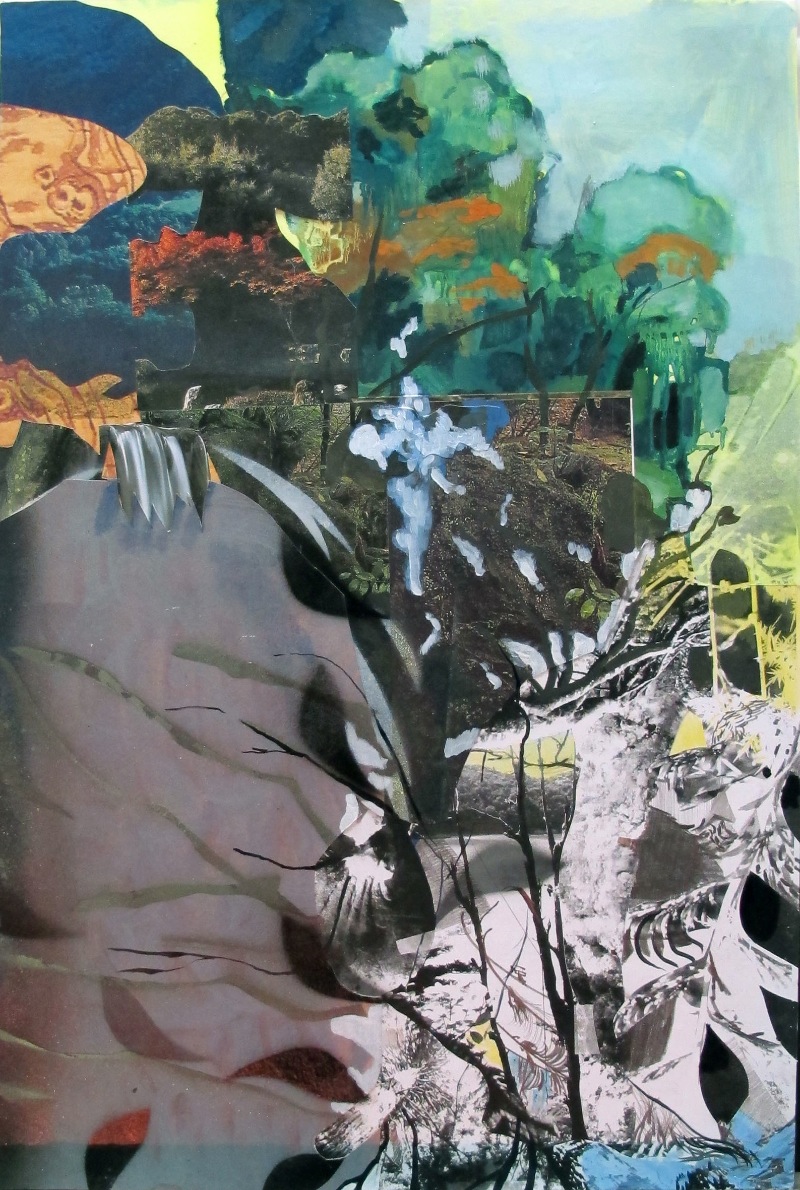 Mischiando tecniche e umori,   sommando strati su strati,   carte,   pennellate,   fotocopie,   immagini trovate e visioni ricordate,   l’artista racconta giardini impossibili,   piante inesistenti,   vegetazioni impazzite. La sua è una natura/cultura che forse ‘pecca’ andando a braccetto con una ben altra e pericolosa immaginazione,   quella virtuale dove non ci sono nè profumi,   nè profondità,   tanto meno riverberi imprevedibili di luce. Se Alessandro realizza queste scenografie senza soggetto umano,    lo fa anche grazie all’assuefatta immaginazione della rete. Noto,   infatti (ma forse lo percepisco solo io),   un’affascinante e strana freddezza in questa sua natura sincopata. Una sorta di traduzione dell’ ‘estetica web’ al mezzo pittorico. (Un’ipotesi sostenuta un paio di anni fa da Raffaele Gavarro nel testo per la mostra ‘Impresa Pittura’ al CIAC Genazzano).