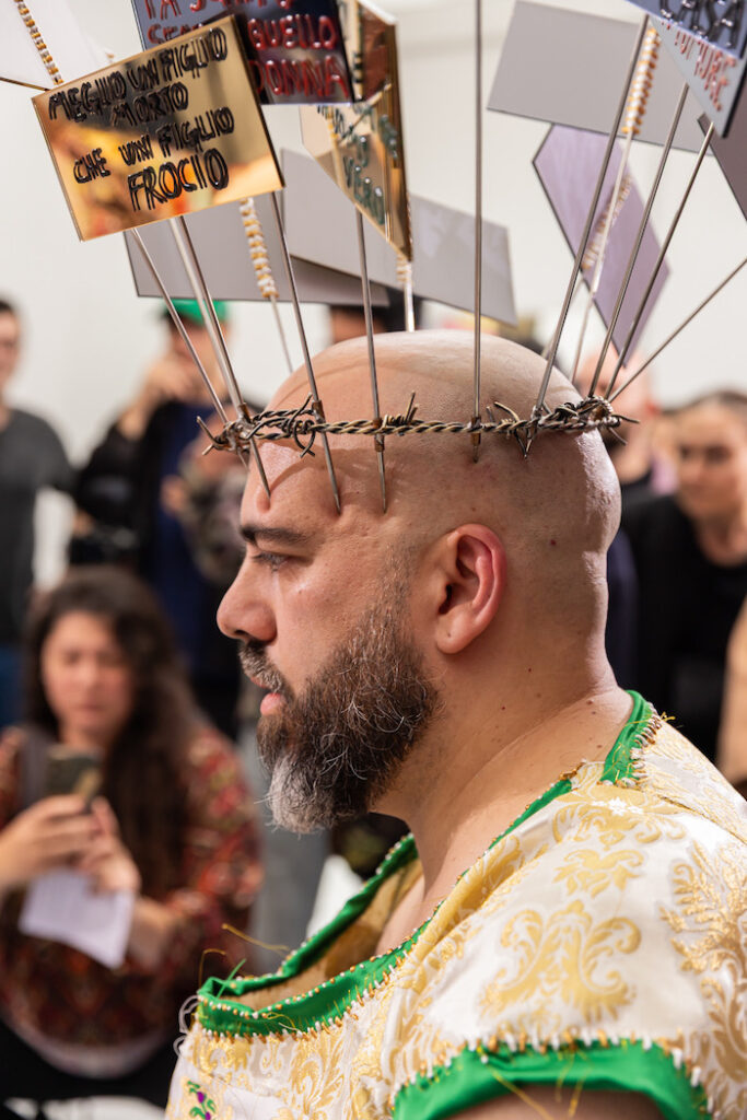 Sul capo del performer una corona di ferro preme con le sue spine metalliche la tenera