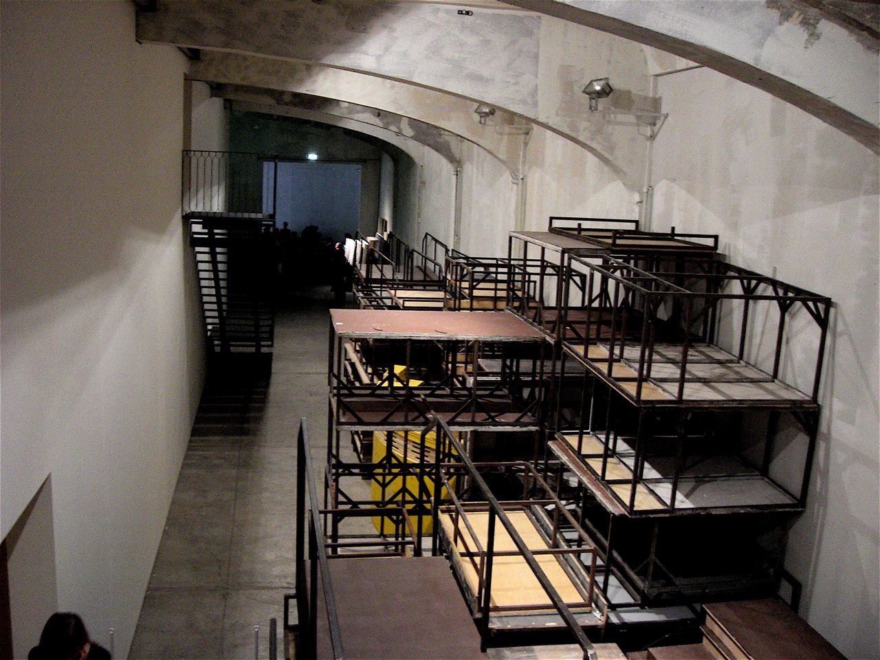 Lamiere di acciaio bugnato, pannelli di polipropilene, passerelle in MDF, piasterelle, telai in alluminio, panche in schiuma polietilenica, costruzioni in cemento armato ecc. La Fondazione Prada è stata trasformata in un deposito ‘qualunque’. Il collettivo di Bruxelles, Rotor, ha rovistato nei magazzini dove dal 1993 sono stati depositati i set delle sfilate di moda delle collezioni Prada per dar vita al progetto ex Limbo. Hanno praticamente spostato del materiale, esattamente come lo hanno trovato, stipato e dismesso. Propongono così – con un gesto alla Dunchamp, scrive Germano Celant – un inventario di materiali di scarto.