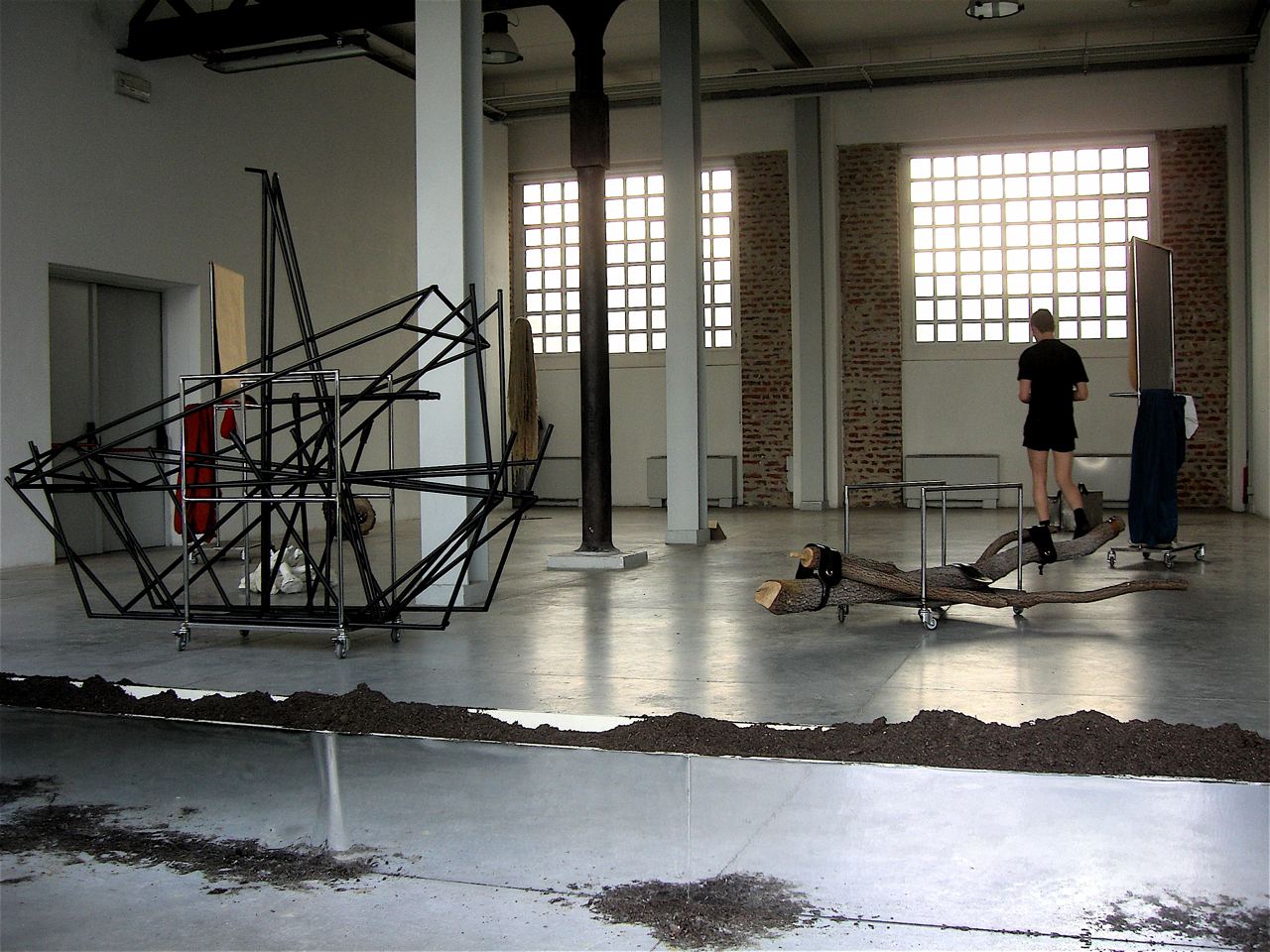 Sono stata a vedere la mostra anche il giorno successivo: lo stesso ragazzo, inespressivo, continuava a spostare pezzi di legno, il carello, alcuni disegni ecc. Il filosofo continuava nelle sue elocubrazioni… il set continuava a turbinare alla ricerca di un equilibrio fallimentare e fragile.