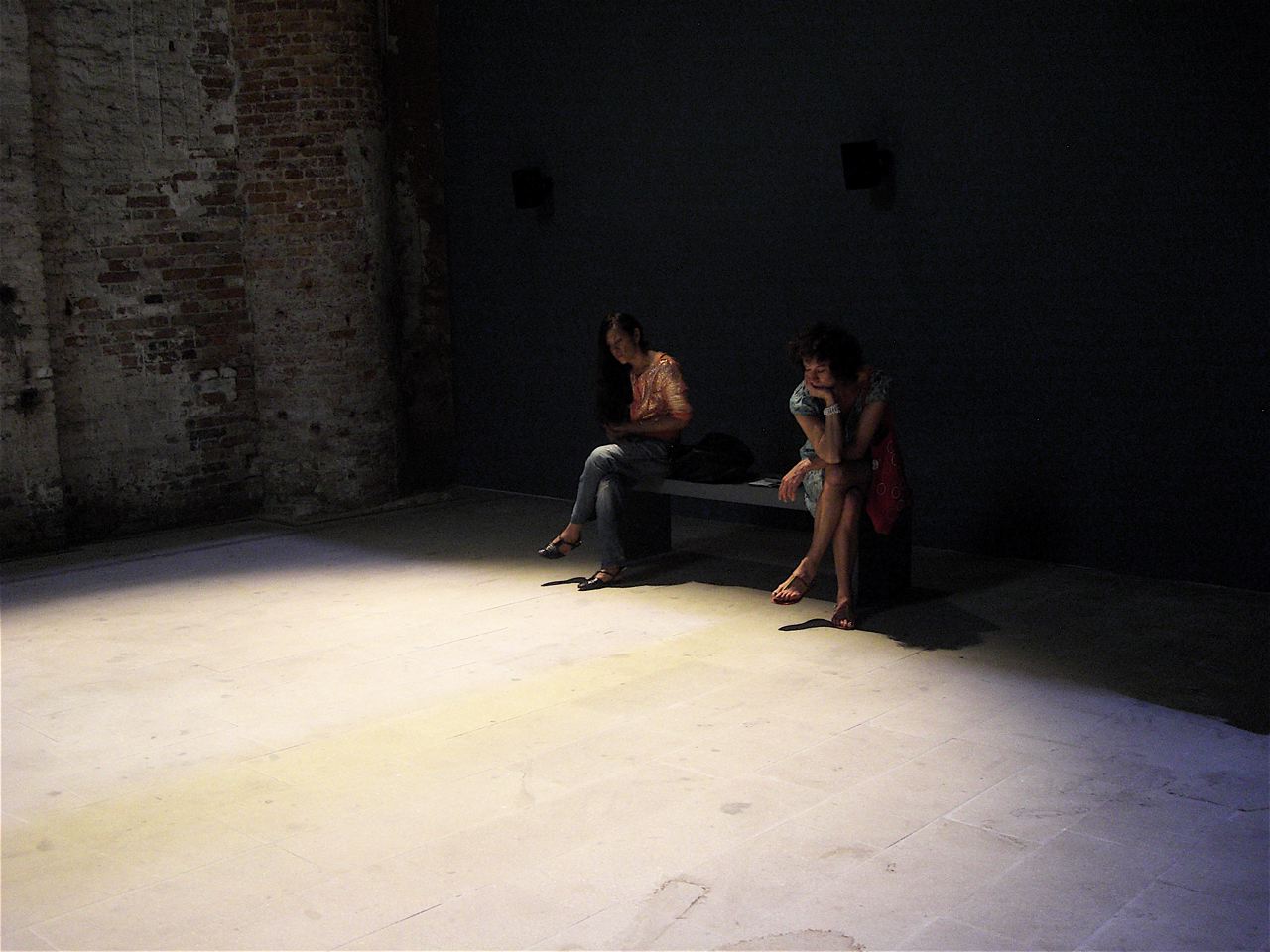 Nella sala successiva, a fianco del muro fotografico dedicato a Shanghai dei Birdhead, la stanza di Meris Angioletti. Mi metto all’ascolto – visto che non c’è nulla da vedere – il complesso intreccio di voci e suoni che compongono la sua opera, ‘Stanzas’, che si presenta come una riflessione su ciò che è percepibile e quello che non lo è in arte. Unica ed eterea presenza, oltre al suono, un fascio di luce che disegna un quadrato sul pavimento.