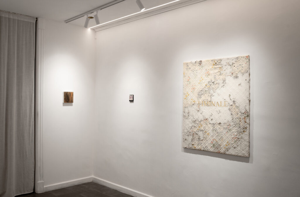 Frutto di questa ricerca ai margini è Liminale, una coperta abbandonata in un parco che perde completamente la sua funzione originaria e viene intelaiata e nobilitata con la foglia oro. In mostra anche una fotografia e una stampa anastatica che riproducono dei dettagli della terra mossa sulla riva dell’Arno, insieme a una serie di dipinti realizzati su tele lavorate con terra e altri elementi naturali.
