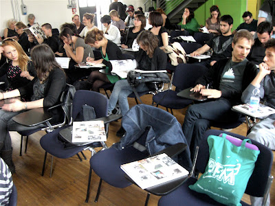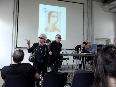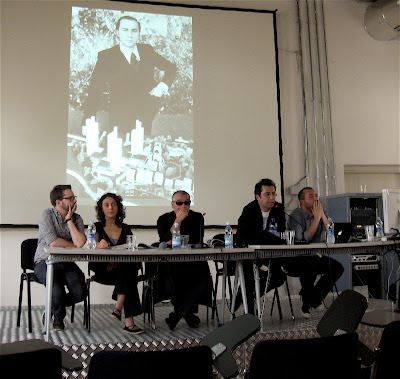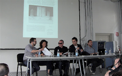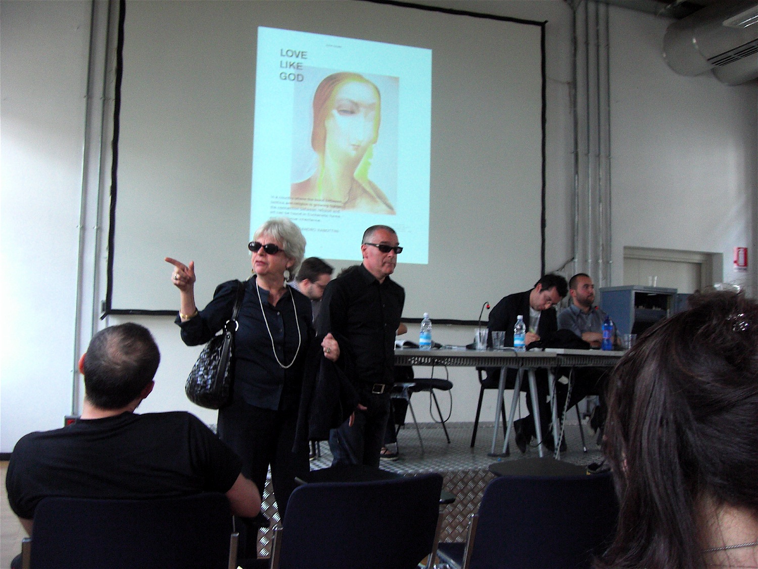 Dopo Casavechia, Marco Scotini. L’esposizione del suo punto di vista, con un taglio decisamente analitico (e, mi spiace, un po’ soporifero. Mi sono anche chiesta: ma perchè non si toglie mai gli occhiali?), verteva sull’anomalia politica, dunque sistematica e di metodo dell’Italia. Ha puntato il dito sulla deriva del discorso dell’arte relazionale iniziato negli anni ’90. Ha constatato che dopo quel decennio l’Italia è stata tagliata fuori dalle grandi kermesse internazionali. Ha portato come esempio Cattelan, che non ha mai partecipato ad un’edizione di Documenta (“schizofrenia molto forte”). “Senza contare che nelle varie Biennali e Manifesta la presenza italiana è per lo più scarsa, debole se non del tutto assente. Trovo che di positivo ci sia il fatto che, forse per la prima volta, l’Italia non si racconta in maniera entusiasta. E’ ancora ingabbiata in clichè. Penso a Bonami e Gioni che considerano la scena italiana attardata, ‘contadina’ insomma che ha perso il treno. (…) Noto finalmente un approccio critico, un mettersi in discussione, un non ostentazione delle glorie passate. Si è smesso di scimmiottare il cinismo di matrice americana.