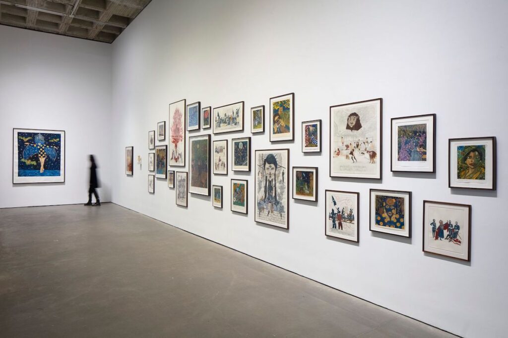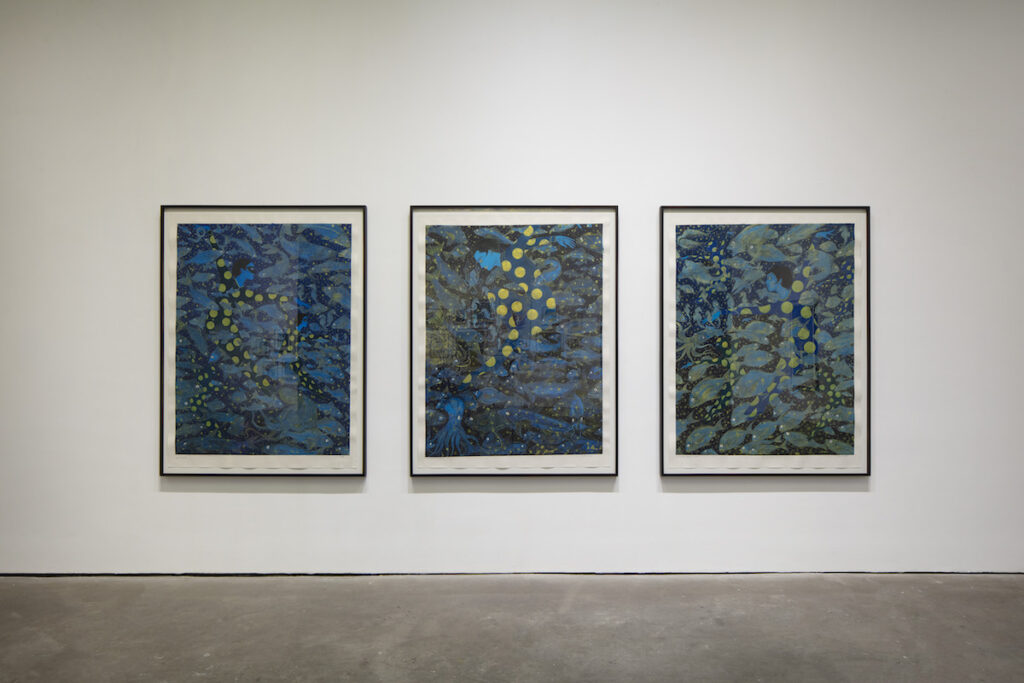 Le opere esposte affrontano temi gravissimi – fascismo, crisi climatica, omicidio – eppure scappano dall’estetica della brutalità. I grandi disegni su carta, realizzati con inchiostro acrilico perlato, acquerello, e grafite, evocano universi acquatici dove galleggiano soli e lune, pipistrelli e creature ibride.