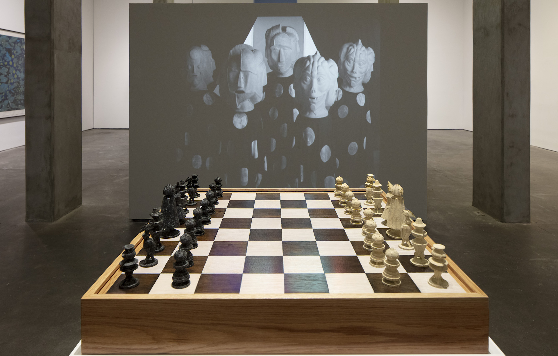 Siamo pedine controllate dall’alto o possiamo scegliere i nostri movimenti? Dzama non dà risposte, ma quando Lorca ribatte che “no poet is ever a pawn […] we poets are all queens,” sembra suggerire che la rivoluzione non consista nel rovesciare il tavolo da gioco, ma nel trasformare ogni pedina in regina, ogni mossa obbligata in danza libera. Questa tensione si materializza in una scacchiera disposta in fondo alla sala con cui siamo invitati a giocare, diventando noi stessi padroni del destino dei piccoli personaggi scolpiti.