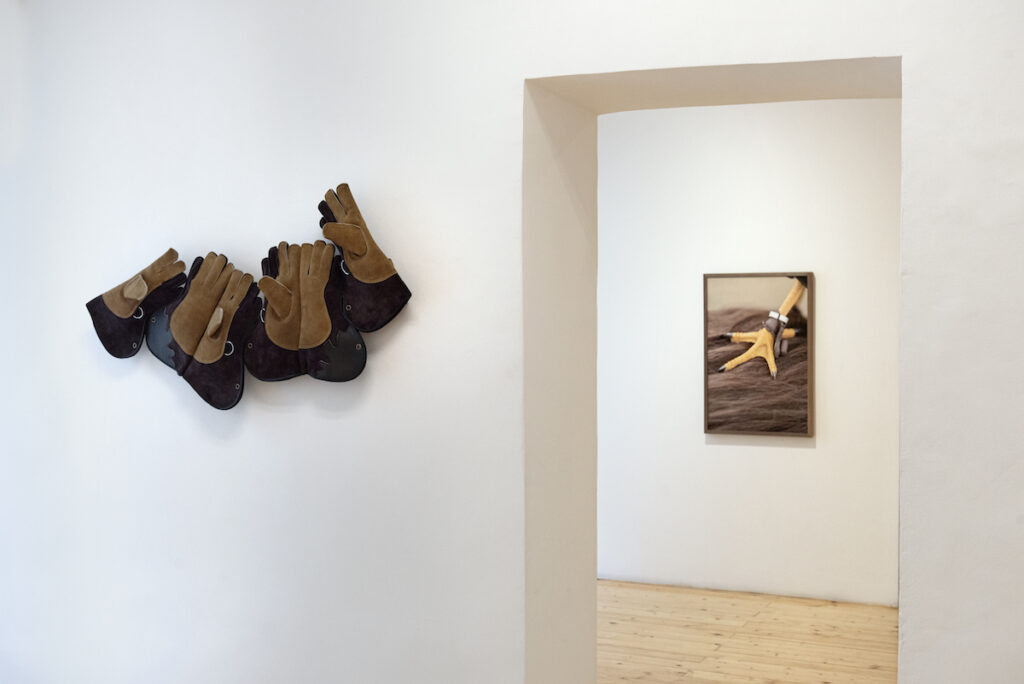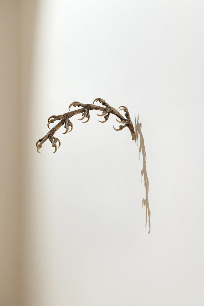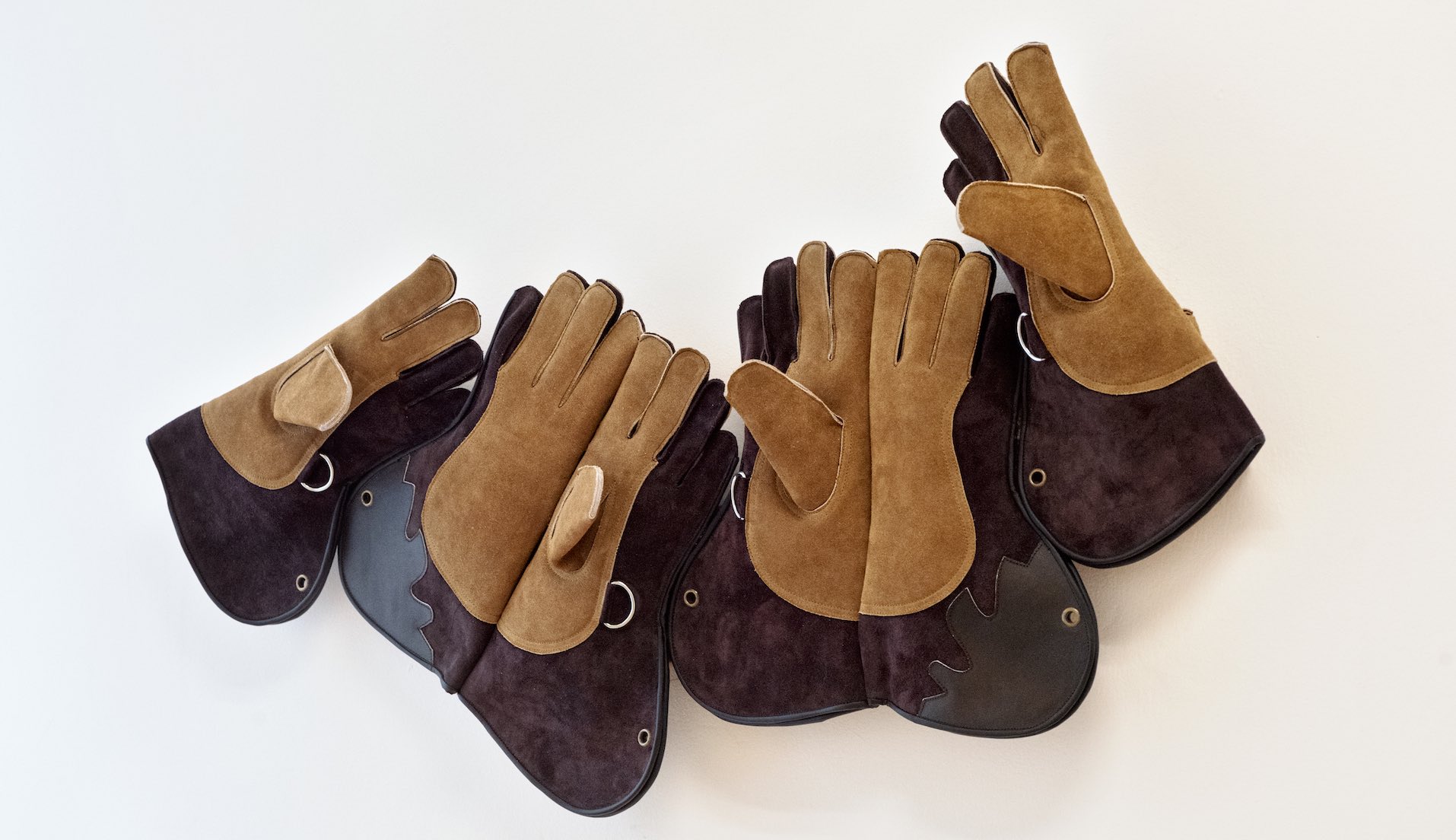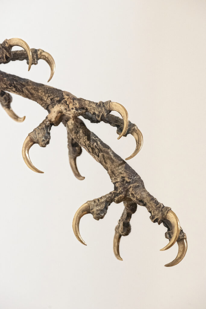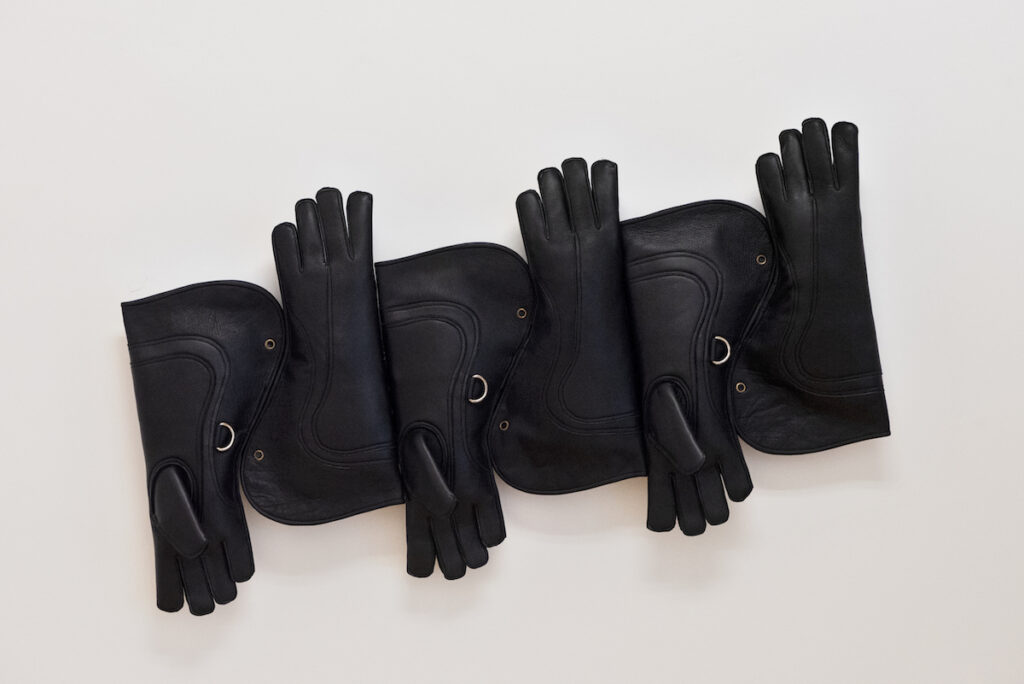 Le fotografie di Please don’t ever come down sono l’inizio. Poi: guanti, artigli, struttura.  La ripetizione è ovunque. Guanti assemblati. Artigli moltiplicati. Il gesto del predatore è fermato a metà. Forma. E psiche. Coazione a ripetere. Potere che torna. Sempre nello stesso punto. Un predatore che finisce per predare se stesso. E non se ne accorge.