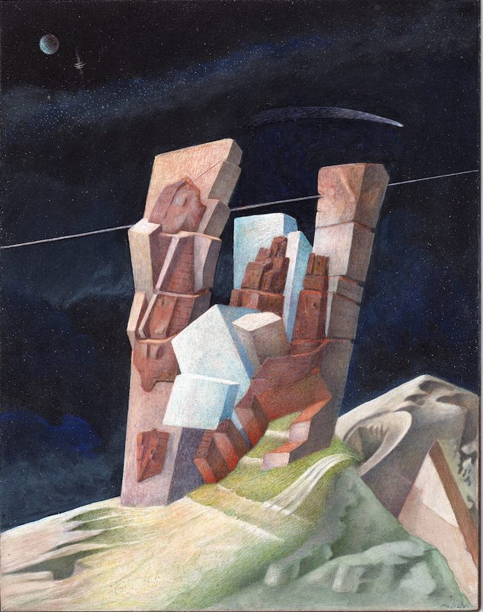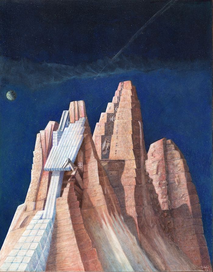 È ciò che precede ogni progetto e, allo stesso tempo, ciò che ne mette in crisi la pretesa di autonomia. Le masse rocciose che emergono nei disegni e nei dipinti di Scolari vengono assunte come paradigma. La montagna non è un modello da replicare, ma una forma che espone l’architettura alla propria insufficienza. Di fronte a essa, il progetto non può che misurarsi con una scala che eccede l’umano, una durata che precede e sopravvive a ogni intenzione. In questa relazione asimmetrica, l’architettura perde il suo ruolo di mediazione ordinatrice. Non organizza il mondo: ne viene attraversata. Le torri e le piramidi che si stagliano contro sfondi spesso indefiniti non sono tentativi di dominio, ma figure di resistenza. Resistono alla dissoluzione, ma anche alla funzione. Non servono a nulla, e proprio per questo continuano a esercitare una forza simbolica.