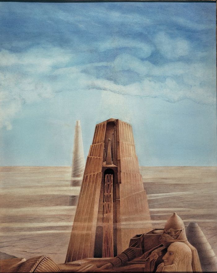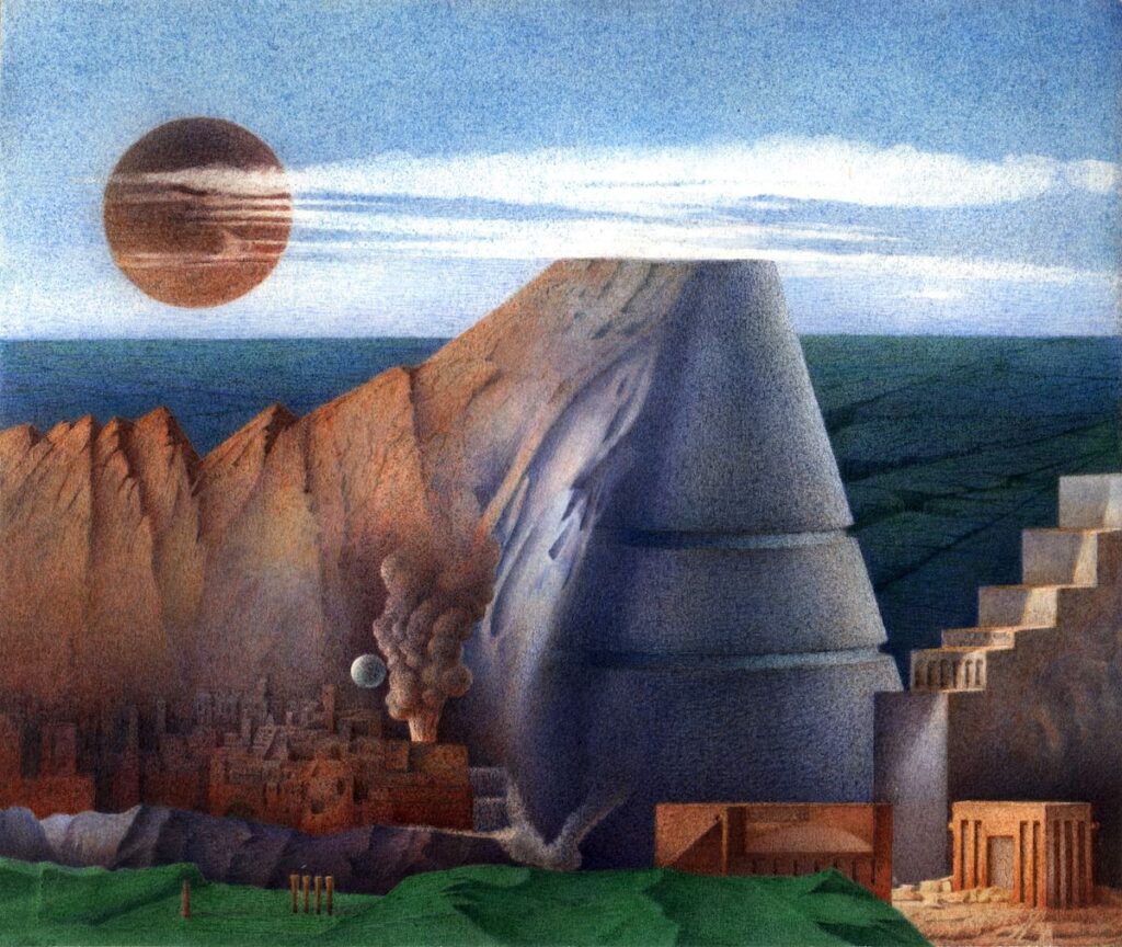 This is what precedes every project and, at the same time, what unsettles its claim to self-sufficiency. The rocky masses that surface in Scolari’s drawings and paintings are assumed as a paradigm. The mountain is not a model to be replicated, but a form that exposes architecture to its own insufficiency. Before it, the project can only measure itself against a scale that exceeds the human, a duration that precedes and outlasts every intention. In this asymmetrical relation, architecture loses its role as an ordering mediation. It does not organise the world; it is traversed by it. The towers and pyramids that stand out against often indeterminate backgrounds are not attempts at domination, but figures of resistance. They resist dissolution, but also function. They serve no purpose, and precisely for this reason they continue to exert symbolic force.
