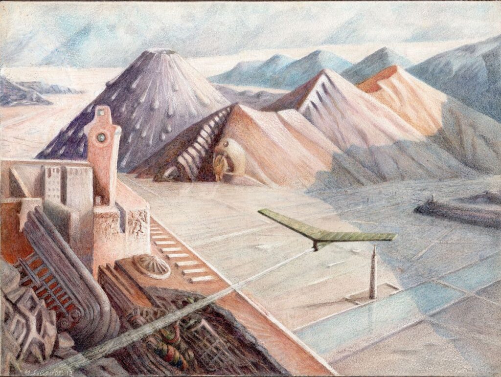 The void that runs through these landscapes is not an absence. It is a constitutive condition. The human figure does not appear, yet its disappearance does not free the space; it renders it denser. The architectures seem built for someone who will not arrive, or for a civilisation that has already exhausted its symbolic momentum. In this sense, Scolari’s drawings do not speak of the city, but of what remains of the city once the city has ceased to be a shared idea.