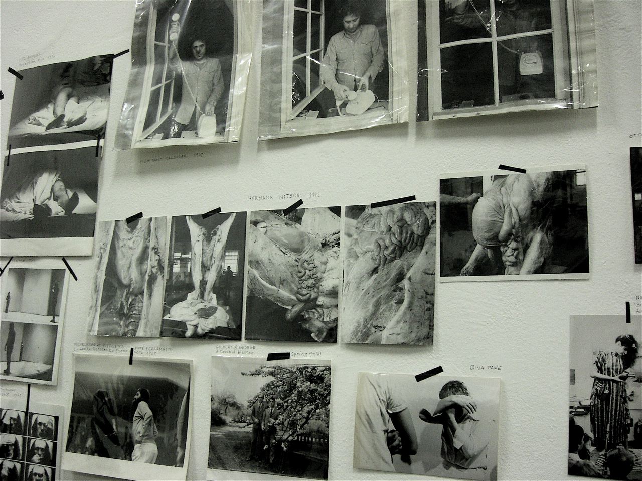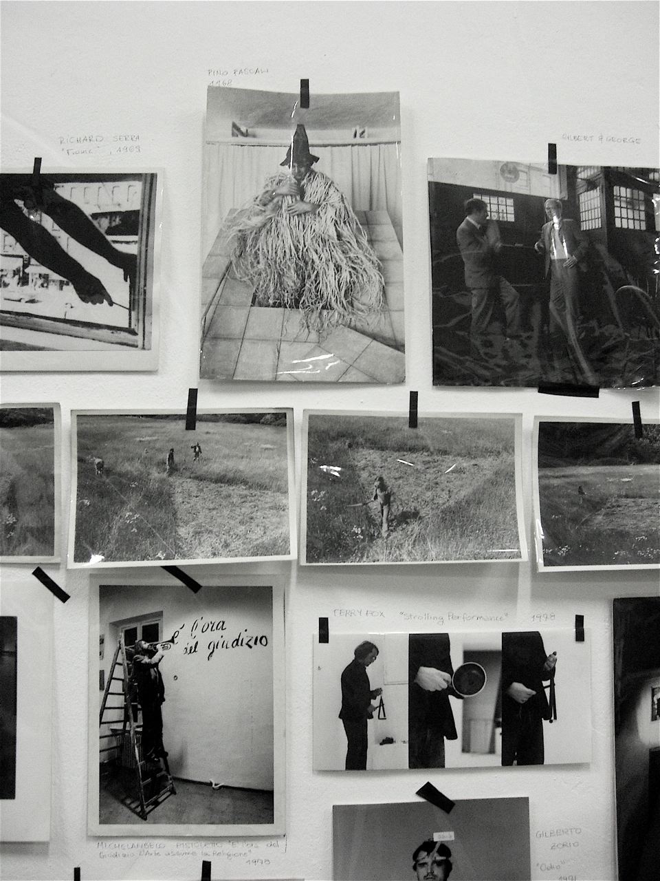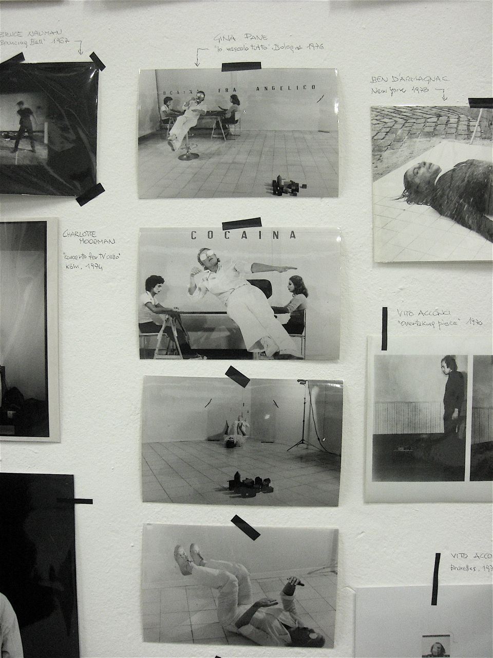 Mostra che rinfresca la memoria sul linguaggio della performance negli anni ’60 e ’70 quella ospitata nello spazio O’ di Via Pastrengo. Per intenderci, lo stesso spazio che ospita anche la serie di performance di artisti contemporanei: Igor Muroni, Nicola Ruben Montini, Giovanni Morbin, Michele Bazzana e Simone Berti. Ancora in programma: Diego Perrone e Christian Frosi, Italo Zuffi. La raccolta di fotografie documentative, mostrano uno spaccato significativo della storia della performance: dall’Abramovic a Gina Pane, a Nitsch e Muehl, Acconci, Oppenheim, De Dominicis, Lüthi, Nauman, Kounellis, Ontani ecc. Passato e presente si intrecciano, dunque, in questo interessante progetto che sfida gli artisti di oggi (alcuni dei quali non propriamente avvezzi con il linguaggio della performance) a confrontarsi con una pratica rischiosa e facilmente criticabile (vedi il mare magnum di commenti che ha scatenato l’intervento di Simone Berti).