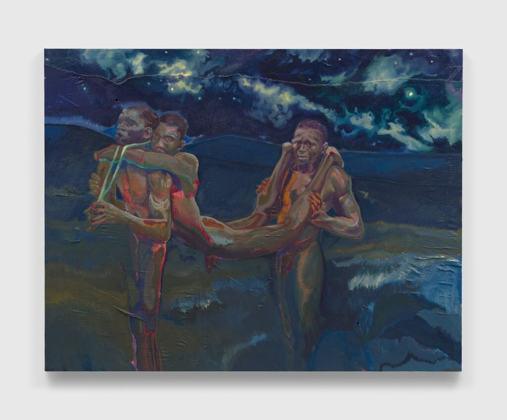 Memoria, migrazione, mitologia: sono queste alcune delle promesse che Armitage dipinge sul lubugo, la “stoffa di corteccia” ricavata dall’albero di Mutuba. Questa fibra naturale è un prodotto artigianale storicamente impiegato dal popolo Baganda (Uganda) in contesti cerimoniali e funebri —nonché patrimonio orale e immateriale dall’UNESCO. La scelta di una tela —purtroppo— troppo poco conosciuta non è casuale, ma rappresenta l’impegno in un progetto decennale dal forte valore simbolico per l’artista: diffuso dall’Africa all’Asia, dalle Americhe al Pacifico, il lubugo non è solo un supporto pittorico sostenibile e rigenerativo, ma si fa emblema identitario, della rinuncia alla “classica” tela di tradizione europea ed espressione delle radici afro-diasporiche di Armitage.