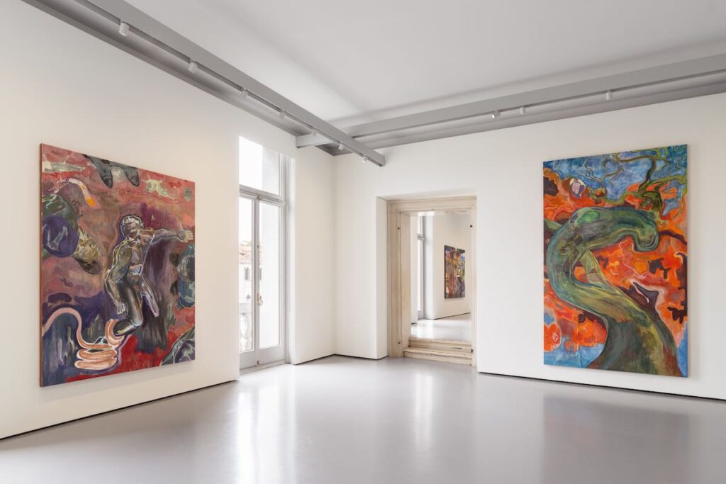 (from left to right) Michael Armitage, Holding Cell, 2021, Courtesy of the artist; Europa, 2025, Courtesy of the artist. Installation view Marco Cappelletti Studio.