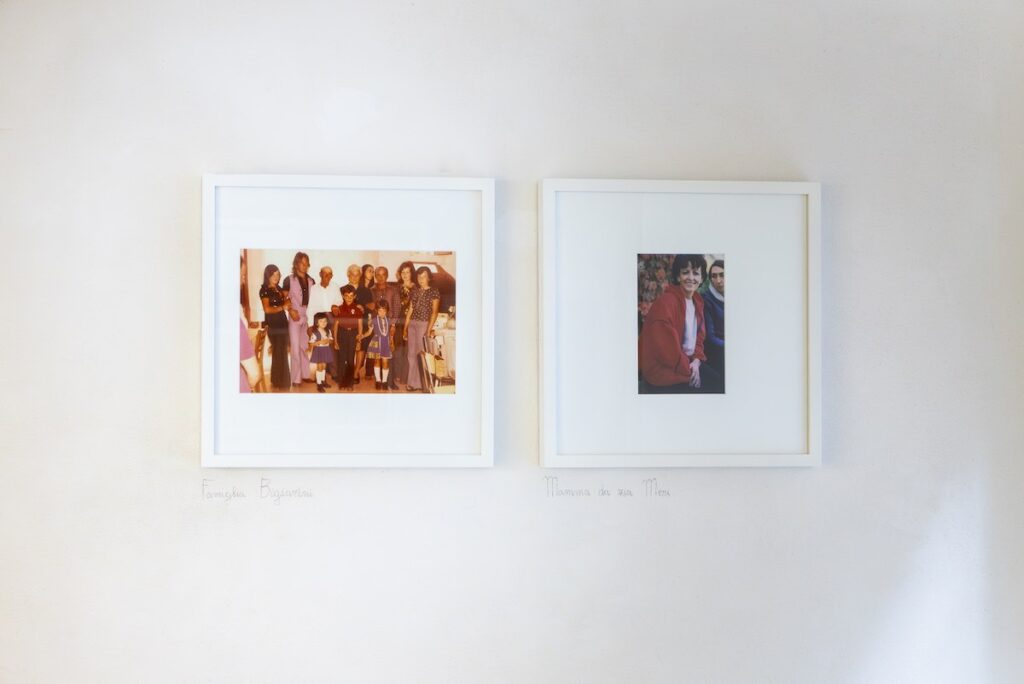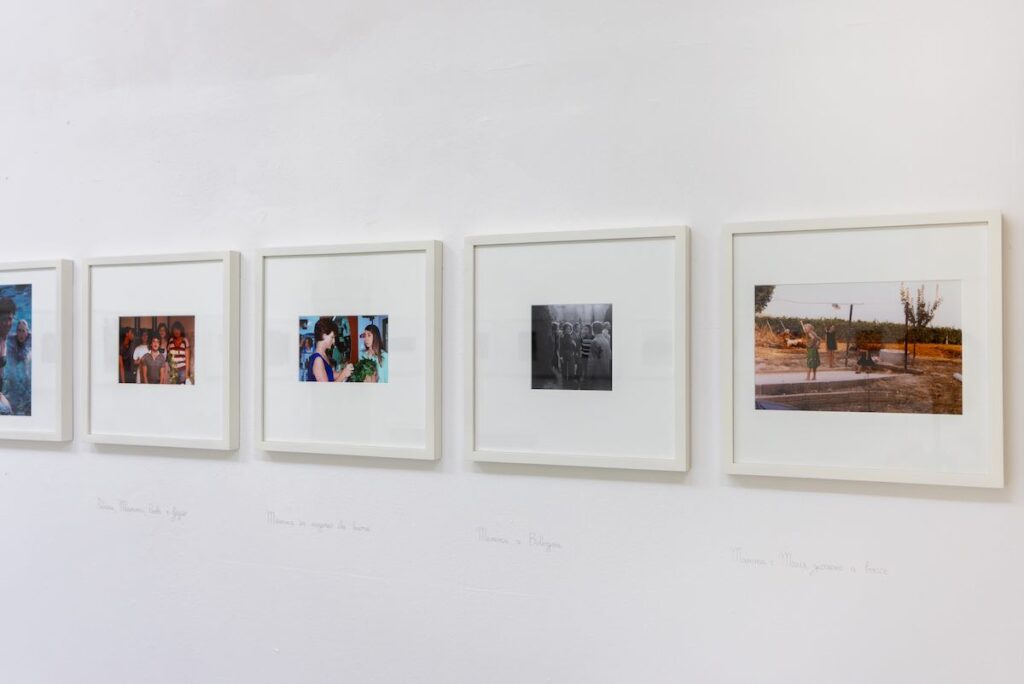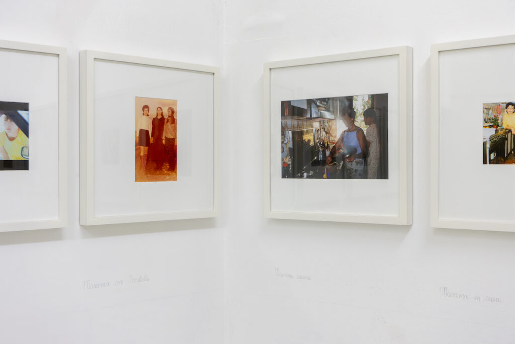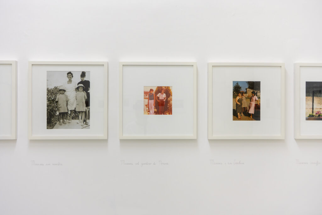 In Mamma con maestra, ad esempio, vediamo la madre bambina ed una compagna in posa assieme alla maestra che le cinge a sé con le braccia; tutte e tre ovviamente hanno lo sguardo fisso in camera mentre Moira, vestita e pettinata alla moda anni degli anni, si pone dietro alla madre, guardandola dall’alto. Proprio nello sguardo, Silvia Mazzucchelli, in un articolo del 2023 riguardante la pubblicazione del volume edito da Corraini, ha notato uno degli aspetti più suggestivi di questo lavoro: “l’atto del guardare non si esaurisce nel cogliere la realtà visiva, ha a che fare con il salvare, il proteggere, mettere in guardia davanti al pericolo. E questa funzione, nel sentire comune, viene affidata alle divinità, ai Lari, ai cari defunti, che appunto ci guardano da lassù. L’atto d’amore della figlia per la madre si rivela nell’inversione dello sguardo, nella figlia che veglia e protegge, con la sua presenza muta e costante, la figura della madre. Il ruolo di cura che la natura ha attribuito alla madre e che la natura stessa ha estirpato, viene così accolto e fatto proprio dalla figlia”.