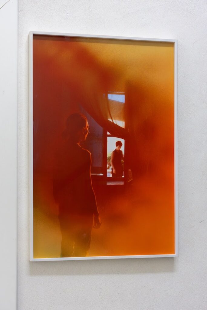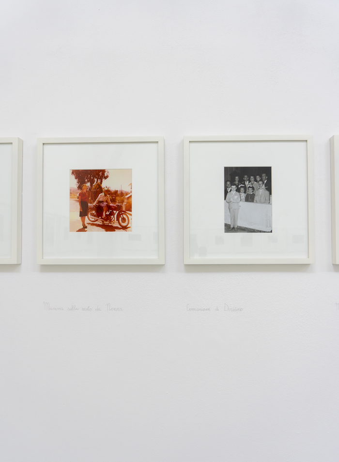 Quando nel 2004 viene improvvisamente a mancare la madre, l’artista ventisettenne si rifugia in quegli album di fotografie che tutti abbiamo nelle nostre case, alla ricerca di dimenticati scatti materni. Da questo accesso al passato nasce il progetto, la costruzione di un nuovo e impossibile album di famiglia: Moira seleziona fotografie precedenti la sua nascita in cui la madre è protagonista e modificandole si inserisce al loro interno. Attraverso un meticoloso procedimento tra lo stage fotografico e il fotomontaggio, comprensivo di studi su ambienti, abiti, luce, coincidenze spaziali, l’artista si materializza nelle istantanee: Fidanzati, Mamma cucina, Mamma innaffia, Mamma sulla motoretta di nonna sono i titoli di alcune delle fotografie, scritti in un corsivo elementare al di sotto di ogni scatto, funzionali a descrivere nulla più di ciò che vediamo. Mentre la madre è intenta a svolgere azioni d’ogni giorno, l’intrusa futura la osserva, come se fosse sempre sul punto di agire e sussurrarle qualcosa di estremamente importante (Autoritratto), con uno sguardo che suggerisce un ruolo non ben definito tra messaggera, protettrice e fantasma. Infatti, al di fuori dello scatto inedito (senza titolo) presentato per la prima volta a Laveronica, in cui la post-produzione va ben oltre il rendere invisibile il fotomontaggio e aumenta la portata epifanica della presenza dell’artista, il lavoro di mimesi e la sapienza tecnica sono indirizzati a nascondere l’operazione falsaria, per venire poi traditi e smascherati dallo sguardo fisso e intenso che la creatrice intrusa concentra sulla madre.