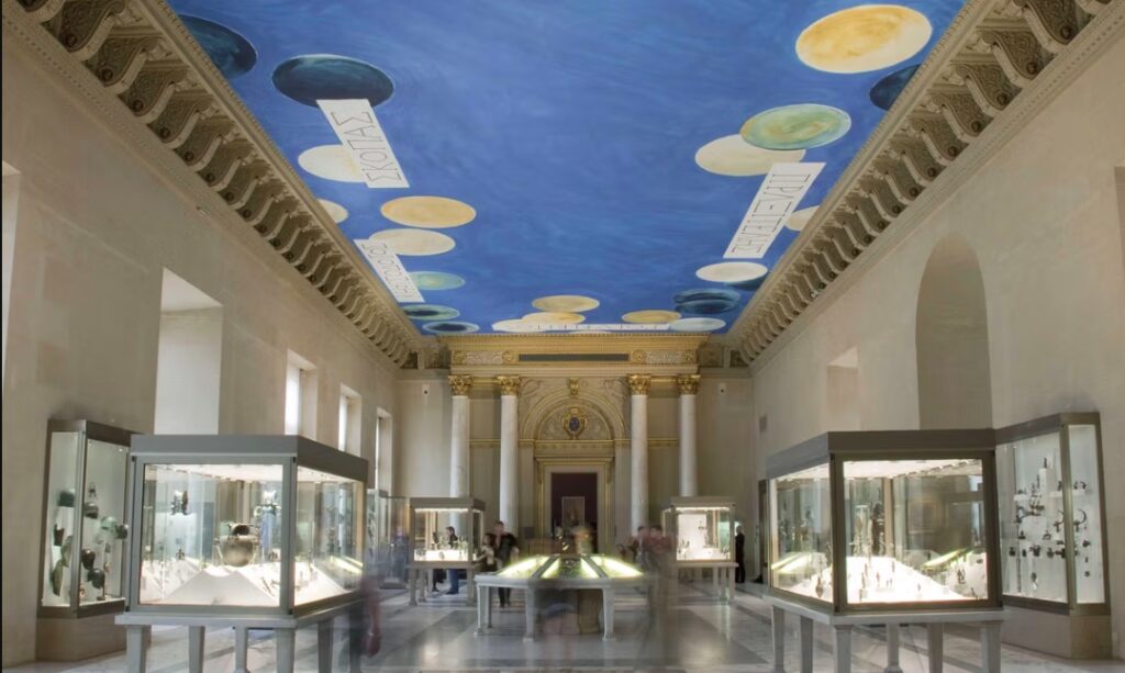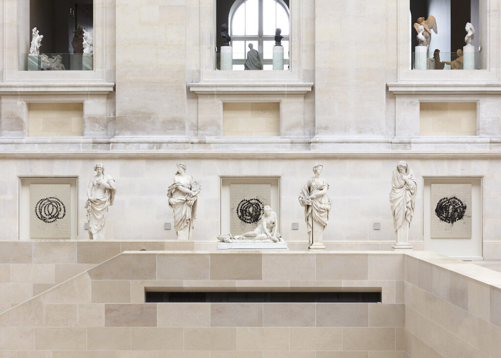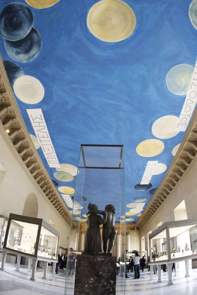 In recent decades, this openness has gradually become structural; it did not emerge suddenly. As early as 2010, Cy Twombly had inscribed his gesture across the ceiling of the Salle des Bronzes, transforming the space into a vault traversed by names and constellations — a permanent intervention intertwining writing and painting, memory and abstraction. The ancient was not overwritten, but crossed by a script capable of reactivating its temporal depth.