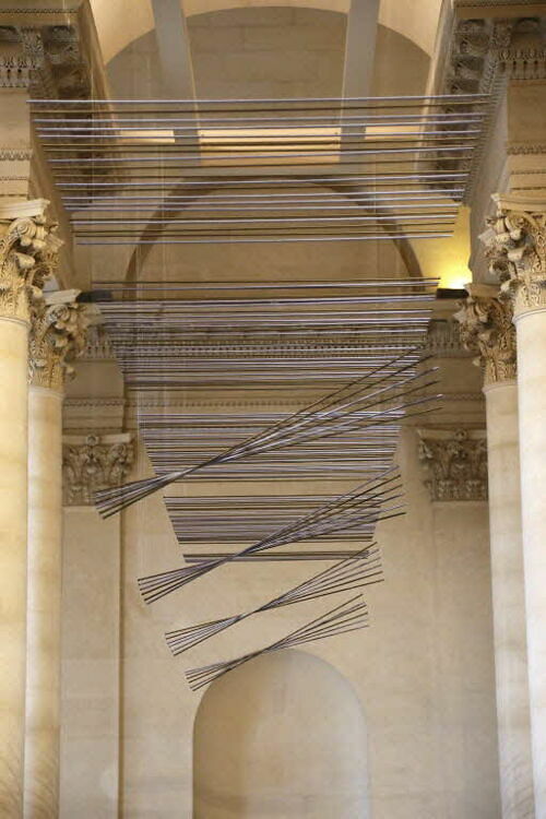 Sulle scale del Midi, L’Onde du Midi di Elias Crespin trasforma l’aria in uno strumento di precisione con un’installazione permanente inaugurata il 24 gennaio 2020, commissionata in occasione del trentesimo anniversario della Piramide. Centoventotto tubi di alluminio oscillano lentamente, mossi da algoritmi che disegnano traiettorie quasi invisibili, un’onda che attraversa lo spazio come un pensiero incarnato. Nel cuore di un palazzo concepito per celebrare l’immobilità del potere e della forma, Crespin introduce una grammatica del tempo: la pietra, attraversata dal movimento, diventa organismo respirante. L’eterno smette di opporsi al mutamento e ne diventa la misura più sottile – l’istante in cui la quiete si piega e vibra.