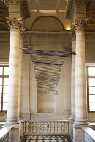 On the Escalier du Midi, L’Onde du Midi by Elias Crespin transforms air into an instrument of precision. This permanent installation, inaugurated on 24 January 2020 and commissioned to mark the thirtieth anniversary of the Pyramid, sets one hundred and twenty-eight aluminium tubes into slow oscillation. Driven by algorithms that trace almost invisible trajectories, they form a wave crossing the space like an embodied thought. At the heart of a palace conceived to celebrate the immobility of power and form, Crespin introduces a grammar of time: stone, traversed by movement, becomes a breathing organism. The eternal ceases to oppose change and becomes its most subtle measure — the instant in which stillness bends and vibrates.