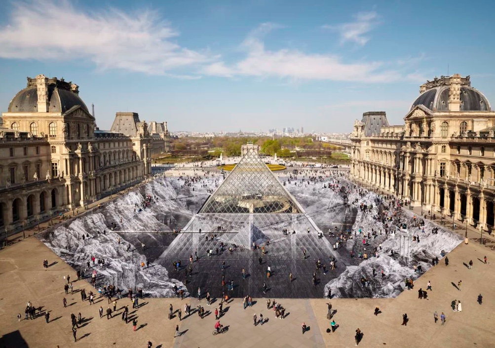 Nel 2016 e poi nel 2019, JR ha scelto di intervenire non all’interno delle sale, ma sulla superficie simbolica del museo: la Piramide stessa. Attraverso una gigantesca anamorfosi fotografica, l’artista ha fatto “scomparire” l’icona contemporanea del Louvre, dissolvendola in una continuità illusoria con la facciata storica retrostante. La Piramide non veniva distrutta, ma resa instabile, temporaneamente invisibile. Il gesto non era decorativo. Era percettivo. Il museo, abituato a custodire immagini, diventava esso stesso immagine manipolabile; la soglia non era più un confine stabile, ma un dispositivo ottico. Con JR, il Louvre esce nello spazio urbano globale, si offre alla fotografia, ai social network, alla circolazione immediata. Non più soltanto luogo di conservazione, ma superficie di proiezione. L’istituzione monumentale accetta di essere messa in gioco, di diventare esperienza condivisa, evento temporaneo.