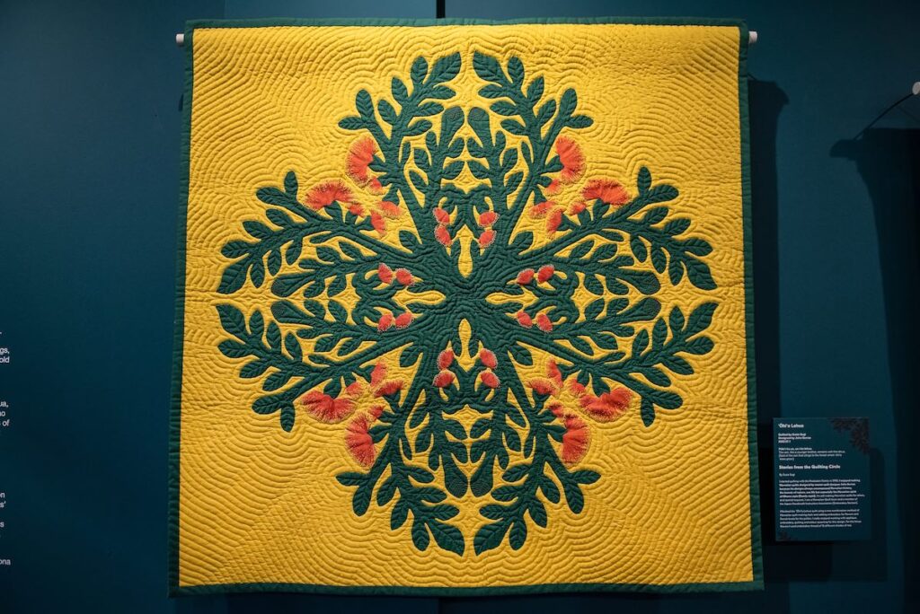Alongside the quilts, the Hulu Nēnē dress by Hawaiian designer Manaola Yap introduces a contemporary dimension that intertwines fashion, identity, and cultural resilience. Inspired by the nēnē — an endemic species of the islands — the garment is displayed as an object, yet implies movement. In a space designed to immobilise, it reintroduces the body.