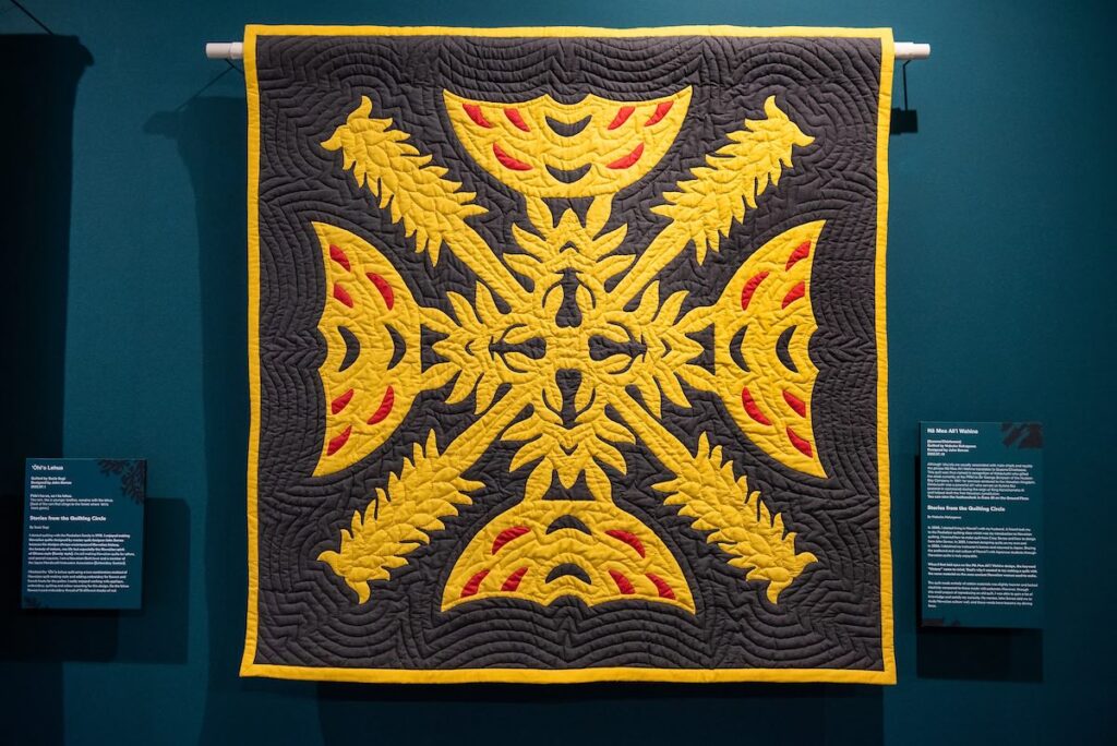 Accanto ai quilt, l’abito Hulu Nēnē del designer hawaiano Manaola Yap introduce una dimensione contemporanea che intreccia moda, identità e resilienza culturale. Ispirato all’uccello nēnē — specie endemica delle isole — l’abito è esposto come oggetto, ma suggerisce movimento. In uno spazio costruito per immobilizzare, implica corpo.