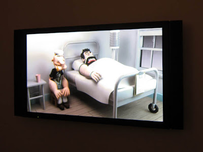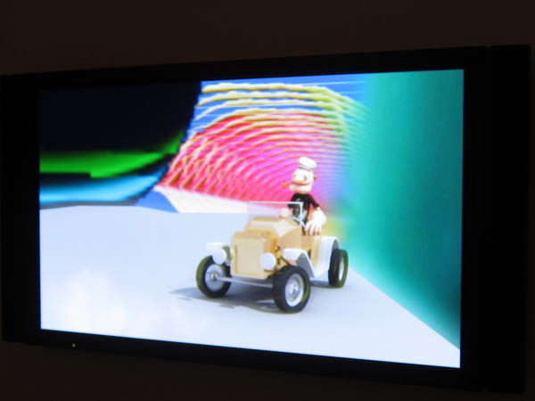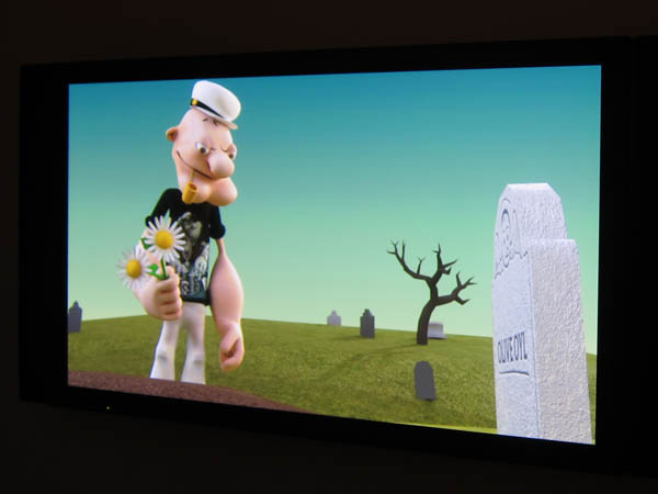 “free”, una collettiva che riflette sul ruolo di internet rispetto alla nozione di spazio pubblico. Il tema è un po’ vago, però la mostra contiene diversi lavori interessanti, tra cui segnalo due video che mi sono piaciuti molto: “19:20” di Alexandra Domanovic, accosta le sigle dei notiziari delle televisioni dei paesi della ex Jugoslavia ad immagini di vita quotidiana negli stessi paesi, la colonna sonora è a sua volta un remix delle sigle stesse realizzato da alcuni DJ tecno; “I Popeye” di Takeshi Murata, una surreale, gustosissima e a tratti psichedelica, animazione digitale che ci presenta Braccio di ferro in versione sfigatissima con tanto di crisi isterica e suicidio finale.