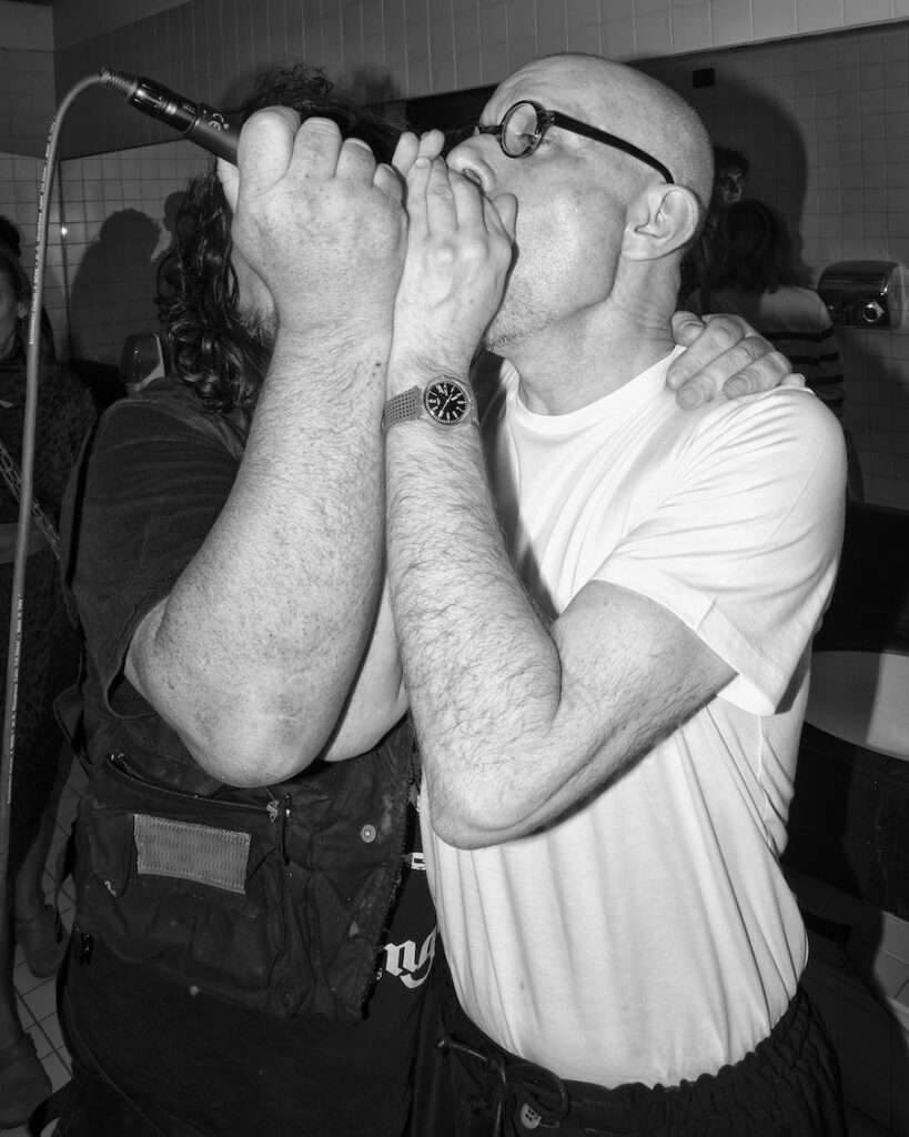 In questo sistema semichiuso, caratterizzato da un flusso osmotico con l’esterno (l’andirivieni dei curiosi e degli utilizzatori dei servizi igienici), un numero relativamente limitato di particelle di base (l’artista, la strumentazione, il pubblico) si eccitava in mille permutazioni reciproche, nel tentativo di esplorare per gioco ogni combinazione possibile: la tastiera veniva premuta addosso a chi capitava vicino all’artista, registrando l’impronta sonora della sua corporeità, oppure era pestata da Benassi con i piedi nudi e con le ginocchia; il sintetizzatore era a disposizione di chi volesse cimentarsi, rapito dal verde neon dell’input del touchpad, nel tracciamento di pattern visivo-uditivi; gli asciugamani a getto d’aria, talvolta usati dall’artista per darsi ristoro dal caldo asfissiante, si rivelavano nuovi strumenti di produzione sonora e così il microfono ne catturava il rumore di ventole.