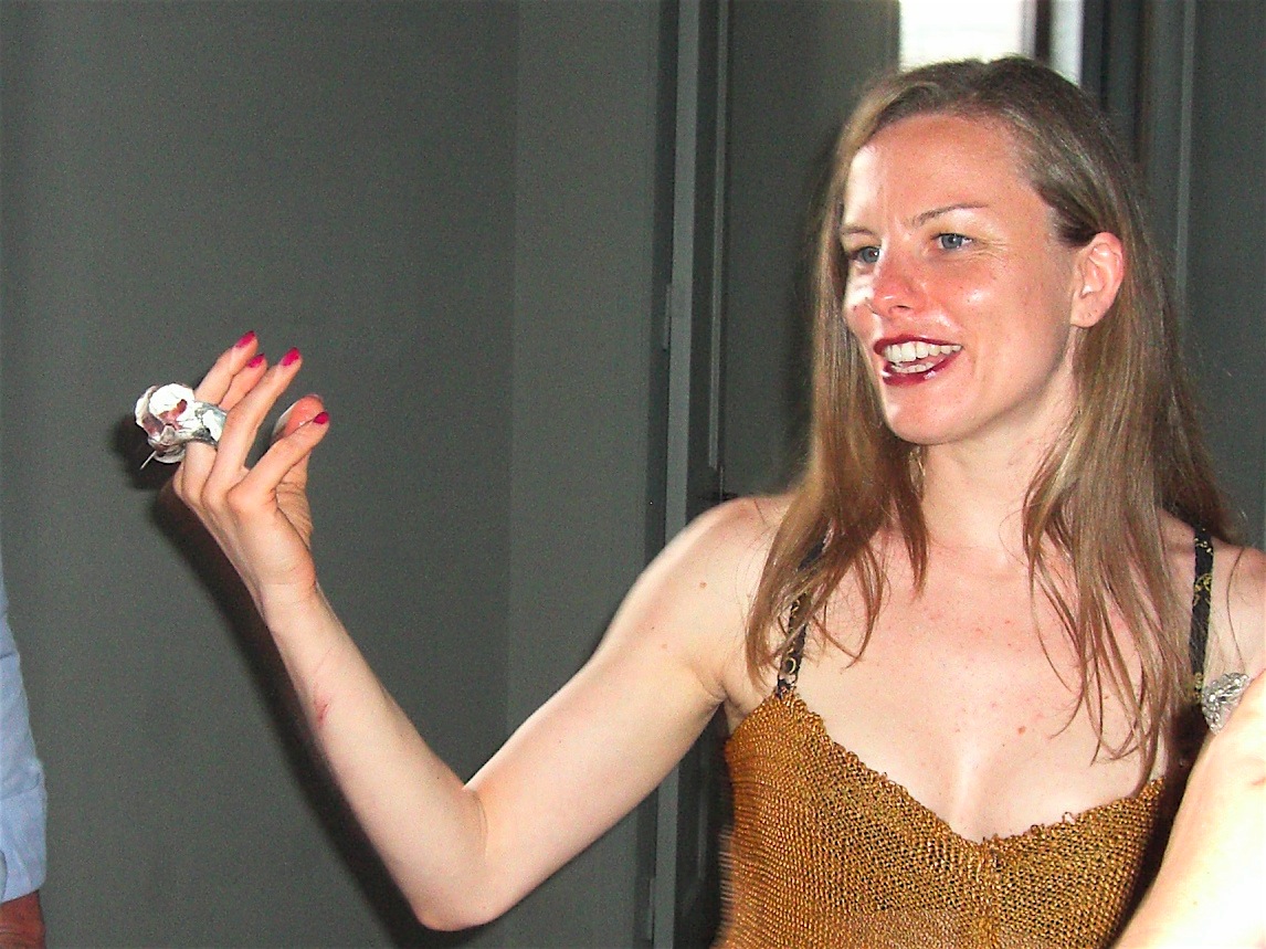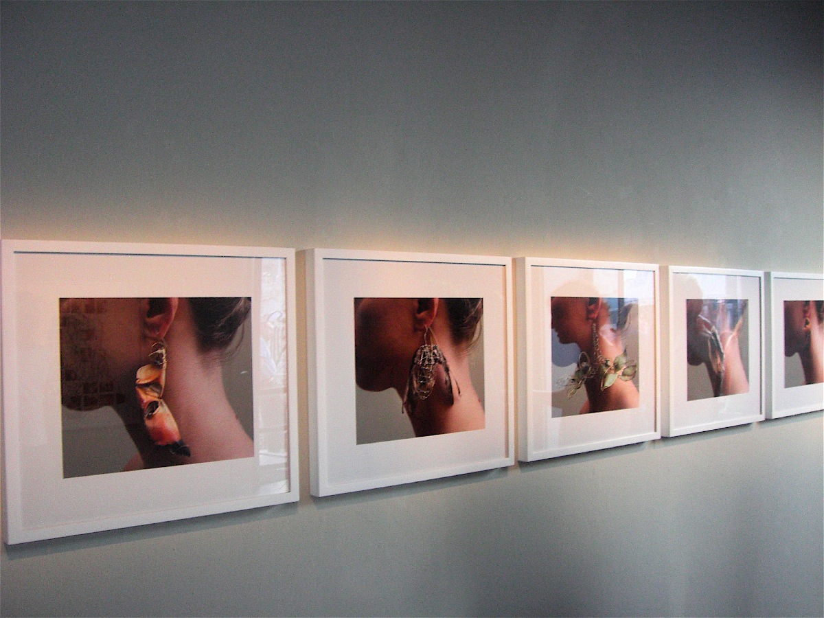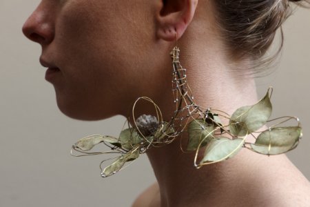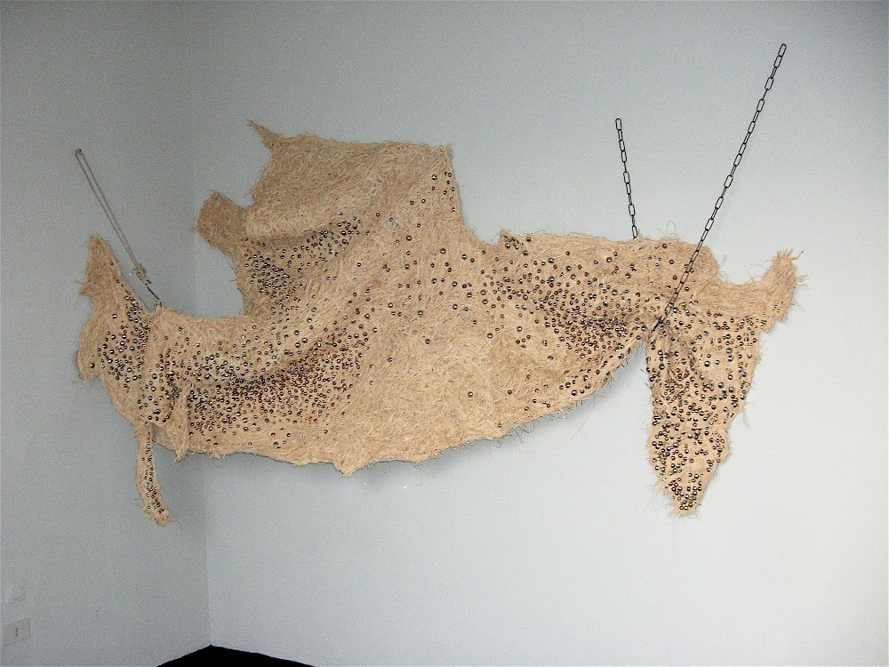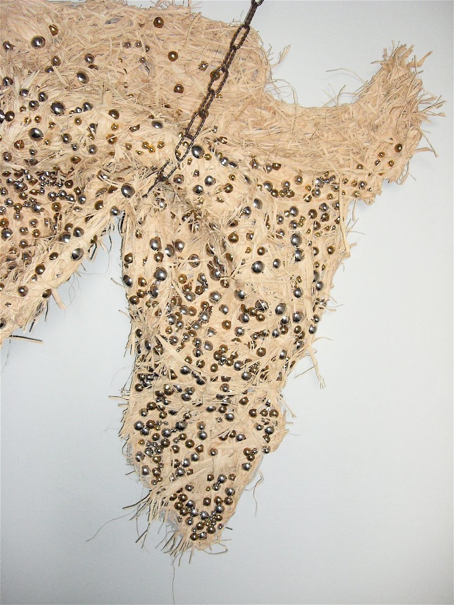 Mi stupisce dunque che, dopo aver camminato in maniera rocambolesca tra sacchetti di plastica e cacche di cane, arrivo nella romantica e decadente scalinata che mi porta alla galleria di Francesco Pantaleone in Piazza Garraffello. C’era l’inaugurazione della mostra ‘La fantasia morde nella piega in bilico’ di Sissi. L’artista mi racconta di quanto bellissima è Palermo; di come lei si è lasciata permeare dalla città che le è entrata dentro… La mostra consisteva in “un arazzo di paglia e borchie, intrecciato a trama fitta. E’ la corazza che nasce sospesa tra un muro e il pavimento. Questa è La fantasia morde la piega in bilico. I materiali sono gli stessi che riempiono i morti mummificati appesi nelle catacombe dei Cappuccini, seicentesco riparo per i reietti della città, anime senza legami e senza sepoltura.” Nell’altra stanza una serie di foto dove l’artista si è immortalata con degli orecchini formati da conchiglie, ali di uccelli secchi, foglie ecc. Oggetti, scarti, paccottiglia che Sissi ha ‘selezionato con l’interesse di uno scienziato in un continente sconosciuto’. Così racconta l’accattivante testo della curatrice Laura Barreca. Continua: ” Sono resti consunti dal tempo, reliquie del presente trovate dovunque, dai lidi vulcanici di Stromboli, ai marciapiedi della Vuccirìa, dalle bancarelle di chincaglierie, ai piedi di un qualche albero. Poi l’oggetto, come un frammento sacro, viene inserito in minuscole gabbie, avvolto in docili strutture che ne assecondano la forma, seguono l’intreccio della materia, classificando le forme secondo le regole del colore, della porosità, rispondendo solo a criteri puramente formali ed enciclopedici.”