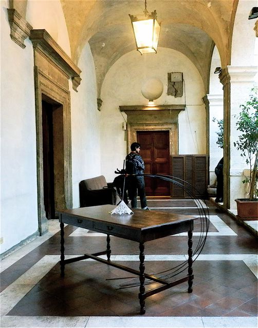 Ai dieci artisti invitati alla mostra Extra Spirito – a Palazzo Baldassini, Istituto Luigi Sturzo a cura di Valentina Ciarallo – è stato dato un tema: prendere spunto da tre concetti fondamentali: memoria, identità e futuro. Difficilissimo mi sembra affrontare questo terna di abissali concetti, senza contare che il luogo della mostra, non è da meno come profondità, complessità e pesantezza. Basti pensare che l’edificio cinquecentesto – opera di Antonio da San Gallo – ha ospitato papi e regnati, è stato decorati da allievi del Raffaello, da Perin del Vaga e Giovanni da Udine ecc… scorrendo tra i secoli giungiamo a metà ‘900 quando diventa sede dell’Istituto intitolato a Luigi Sturzo (nel 1900 fu visto tra i fondatori della Democrazia Cristiana Italiana). In soldoni per dire la ‘responsabilità’ che questi artisti avevano sulla spalle.