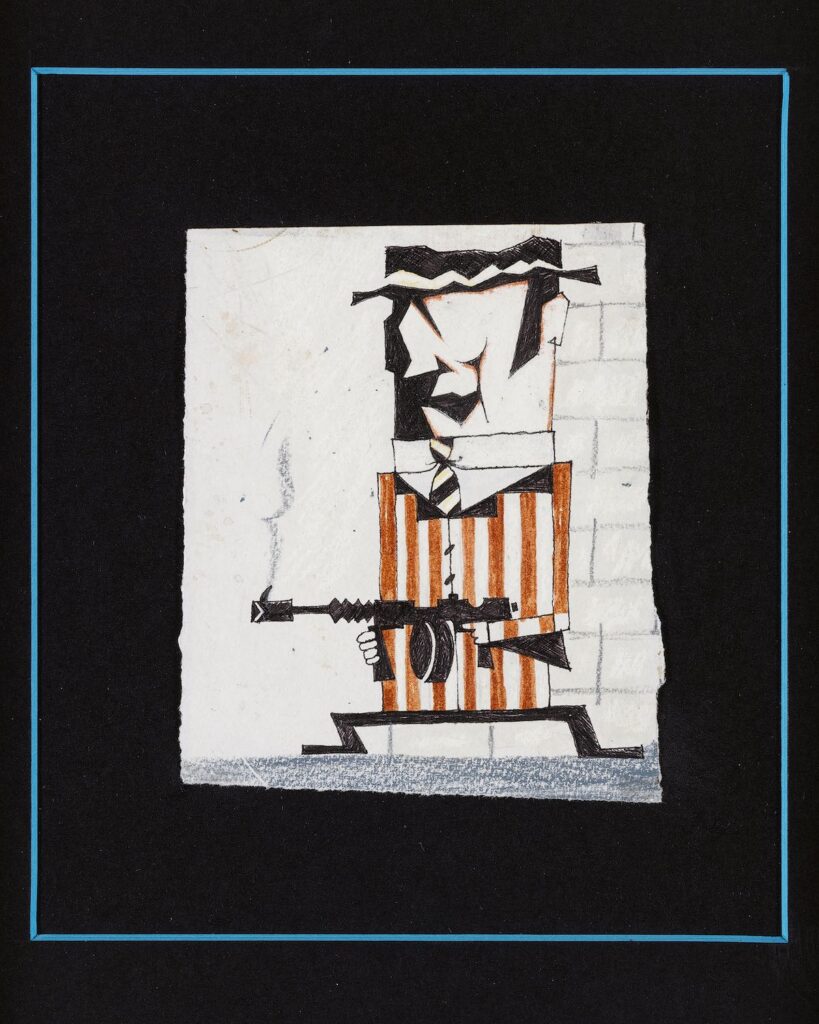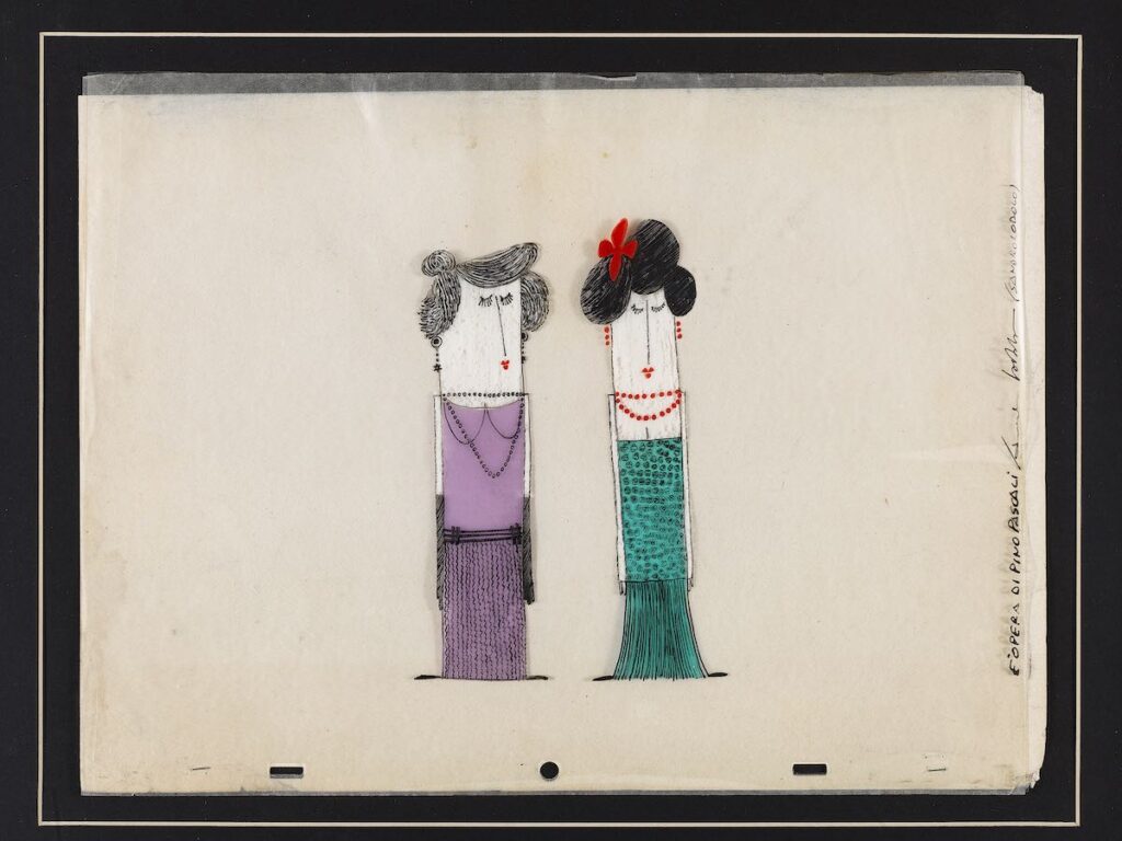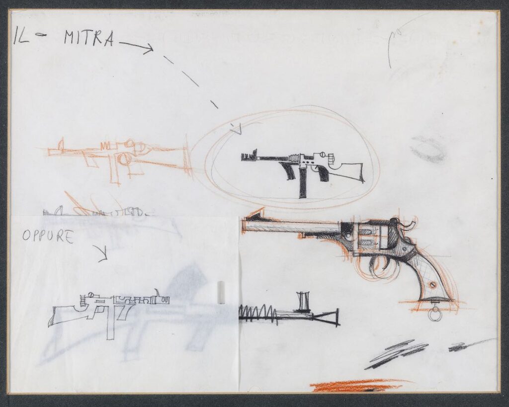 Per lo spot carosello Cirio “Il paese del Sole” (1965) Pascali si serve anche delle fotografie che lui stesso scatta a Napoli nel 1965 con la sua Linhof a monorotaia, fotografie apprezzate da Lodolo ed esposte in mostra insieme alla macchina fotografica. Ad affiancare Sandro Lodolo e Pino Pascali alla Lodolofilm ci sono Giuliano Cappuzzo e, soprattutto, Niso Ramponi in arte Kremos. Nel percorso espositivo le tavole grafiche di Pascali e di Kremos si alternano continuamente senza evidenziare grosse differenze stilistiche: in quegli anni i due artisti remano nella stessa direzione e inventano uno stile pubblicitario divertente, efficace e accattivante, nuovo per l’epoca e destinato a fare scuola. Negli stessi anni Pascali lavora come aiuto-scenografo di Carlo Cesarini da Senigallia in Rai per trasmissioni di successo, come Biblioteca di Studio Uno (1964). Per il programma, accompagnato dalle musiche del Quartetto Cetra, Pascali realizza le scenografie, i cui disegni sono esposti in mostra, di fiction musicali quali Il Conte di Montecristo, La Primula Rossa, La storia di Rossella O’Hara, I tre Moschettieri ecc.