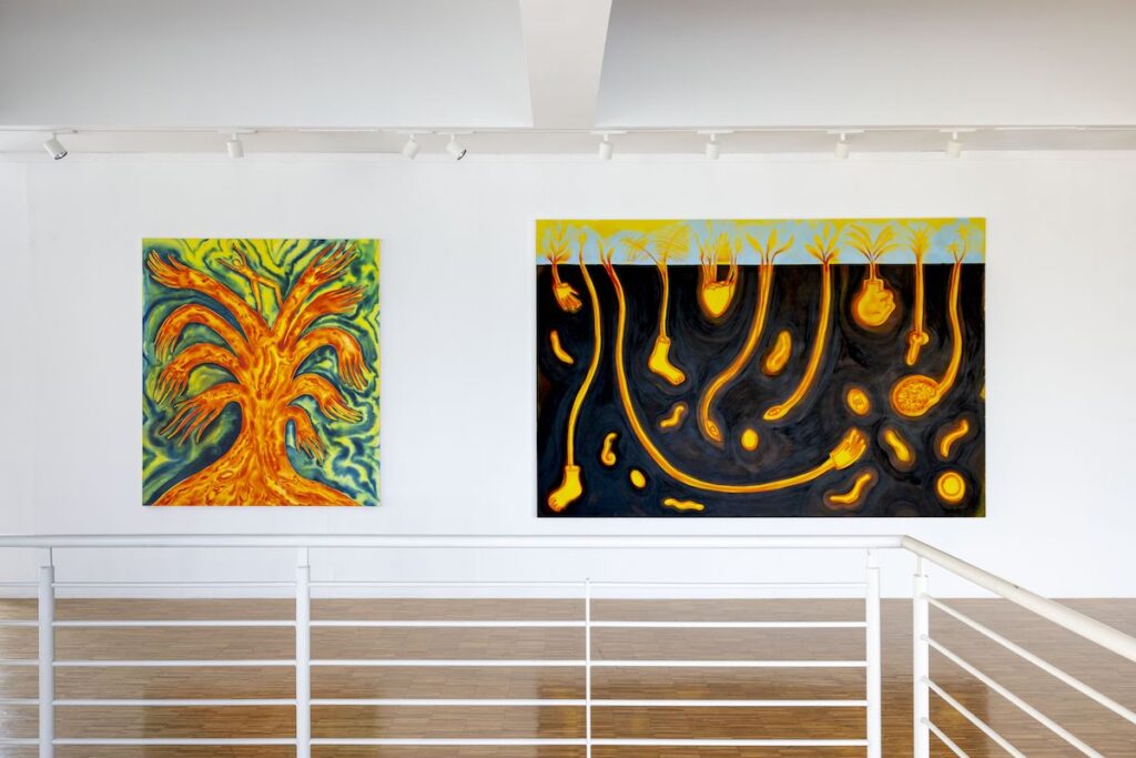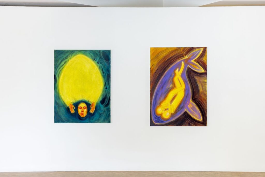Al secondo ed ultimo piano, sotto la curatela di Hanne Mugaas, trovano posto le artiste Cecilia Granara e Giuliana Rosso. Entrambe lavorano sul tema dell’identità femminile e del corpo, ma con linguaggi completamente differenti. Cecilia Granara, nata a Gedda e attualmente attiva in Messico, utilizza grandi tele dai colori acidi e densi per rappresentare la vita, la morte e il ciclo della rinascita. Le sue opere giocano con elementi simbolici e vitalistici, dove il corpo umano, nelle sue parti anatomiche più evidenti, sembra rinascere e rigenerarsi attraverso un processo di disgregazione e ricomposizione.