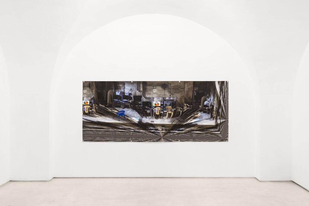 In mostra, una selezione di nuovi lavori – principalmente fotografie ottenute partendo da una manipolazione dell’immagine per tramite di un software di animazione 3D – ribalta percettivamente la relazione di interscambio tra realtà e finzione. Nel fare questo – attraverso scomposizioni labirintiche, rasterizzazioni vorticose e interferenze visive come in un glitch – di Martino restituisce un contro-spazio, sospeso all’interno di una logica narrativa stravolta, ma concretamente radicale nel suo farsi testimonianza di ciò che accade davanti ai nostri occhi. È in qualche modo l’inverarsi di uno spazio altro, quello in cui centinaia di adolescenti, attraverso la realtà virtuale, scoprono la loro giovinezza in un momento di transizione privato di questa possibilità, costruiscono legami solidali e storie d’amore, intessono relazioni affettive. Le gaming room – spazi informali, spesso privi di luce, e organizzati alla bene e meglio – diventano dei luoghi simbolici, e di appartenenza, attraverso cui di Martino documenta un contesto molto più ampio – ibridando la fotografia di reportage con una ricerca visuale che si appropria dell’animazione 3D per generare una crasi tra realtà e finzione. In questa tensione metalinguistica ascritta all’immagine, emancipata dalla necessità del documentarismo, si risolve tutta la ricerca collegata a questa serie di lavori – punto di avvio di un progetto più ampio che l’artista sta sviluppando sotto forma di lungometraggio e che, in parte, è stato presentato nella grande mostra tenutasi presso l’IIC di Beirut, in collaborazione con il Beirut Art Center, e curata da Maria Rosa Sossai.