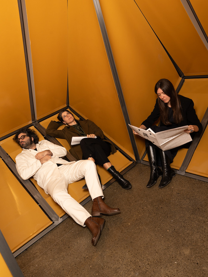 Lo spazio condiviso dello score prende poi forma architettonica nel progetto OSA – Osservatorio Sant’Anna, ideato da Maria Eugenia Frizzele e dal duo Lemonot. Qui l’atto del risuonare diventa rigenerazione urbana, immaginazione civica e costruzione di scenari futuri. Viene presentato – attraverso una struttura che si articola tra il design e l’architettura – un video: un archivio vivo fatto di workshop, tavole rotonde e paesaggi sonori. L’infermeria militare di Sant’Anna a Venezia si prefigura come luogo dove la partecipazione non viene solo documentata ma continuamente riattivata. L’installazione presentata in mostra restituisce questo processo come un organismo in trasformazione, una piattaforma di possibilità che interroga criticamente le metodologie partecipative e la natura stessa dell’architettura come pratica collettiva.