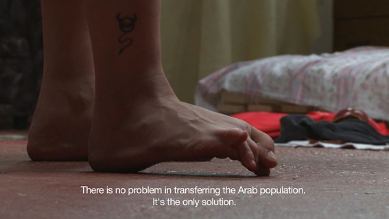 Impressionante il video Out (Tse). Il mediometraggio inizia con una doppia intervista di due ragazze attivamente impegnate nella scena BDSM (Bondage – Domination – Sadism – Masochism) in Israele. Dalle varie risposte che danno, si capisce che una è di destra mentre l’altra è di sinistra; una preferisce sessualmente il ruolo ‘dominante’, mentre l’altra di ‘sottomessa’. Dopo circa metà video, si vedono entrambe in un salotto dove i loro ruoli si invertono. In un crescendo di violenza, la dominante frusta quasi a sangue la sottomessa. Quest’ultima, alterando il tono di voce (sembra a tratti citare il film l’Esorcista’), pronuncia delle frasi che sono citazioni dirette dai discorsi militanti e razzisti di Avigdor Lieberman, ministro israeliano degli Affari Esteri. Alle urla e frustate, si intravedono dei frame dove compare la rappresentazione del demonio.
