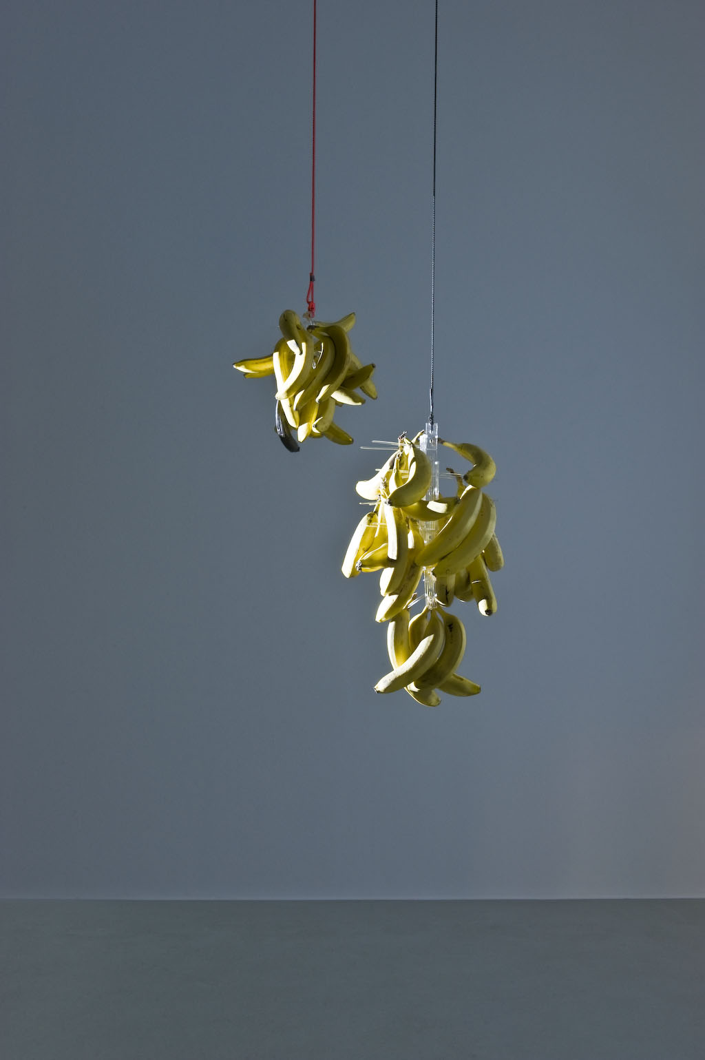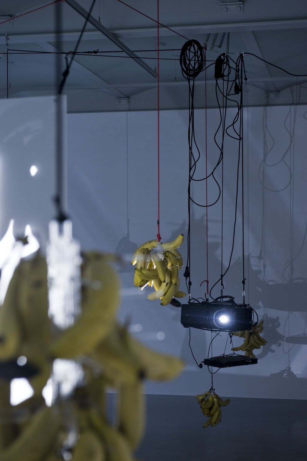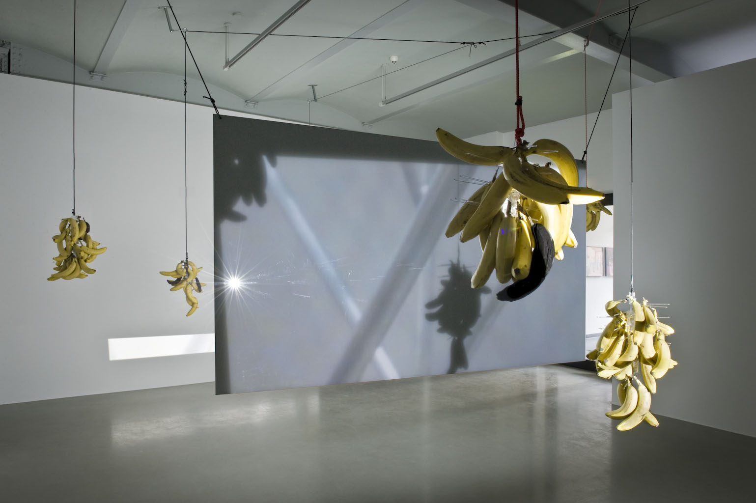 Il video proiettato mostra una macchina che ho trovato al Banjamin Franklin Institute di Philadelphia, dove al posto della solita estetica scientifica, silenziosa, astratta, anonima, i gravi coinvolti dal moto sono rappresentati come delle banane. Tutto parte da li, ne ho fatto un video col telefonino. Dopo qualche mese ho capito che bastava “gonfiare” il video dello spazio, usarlo come un seme, come un punto di partenza, da sviluppare, da far crescere letteralmente. Andava sviluppato rispettando la logica presentata dal video, le stesse leggi di natura. Se si trattava di pseudo-banane di bronzo, ecco che dovevo usare banane vere …