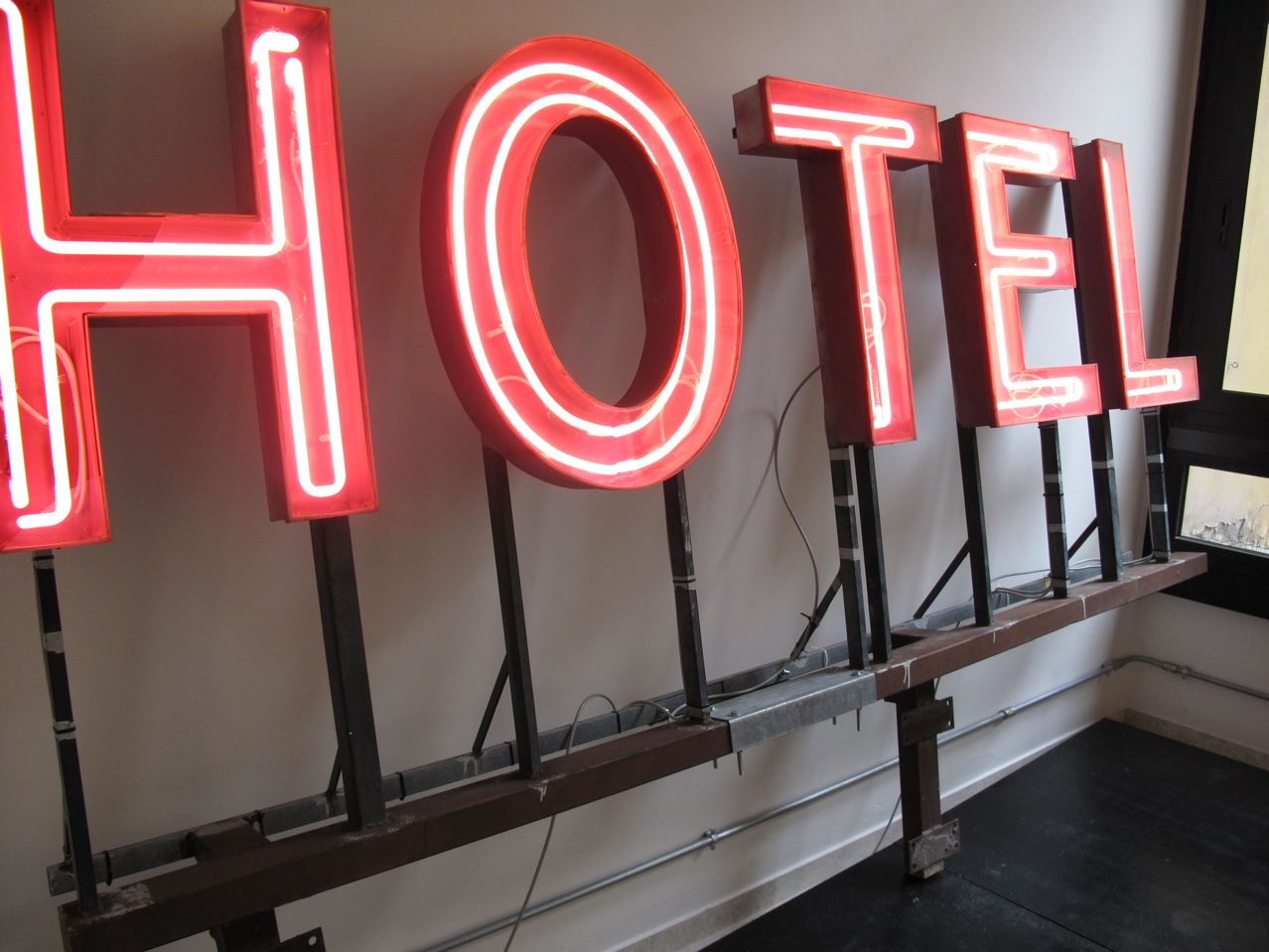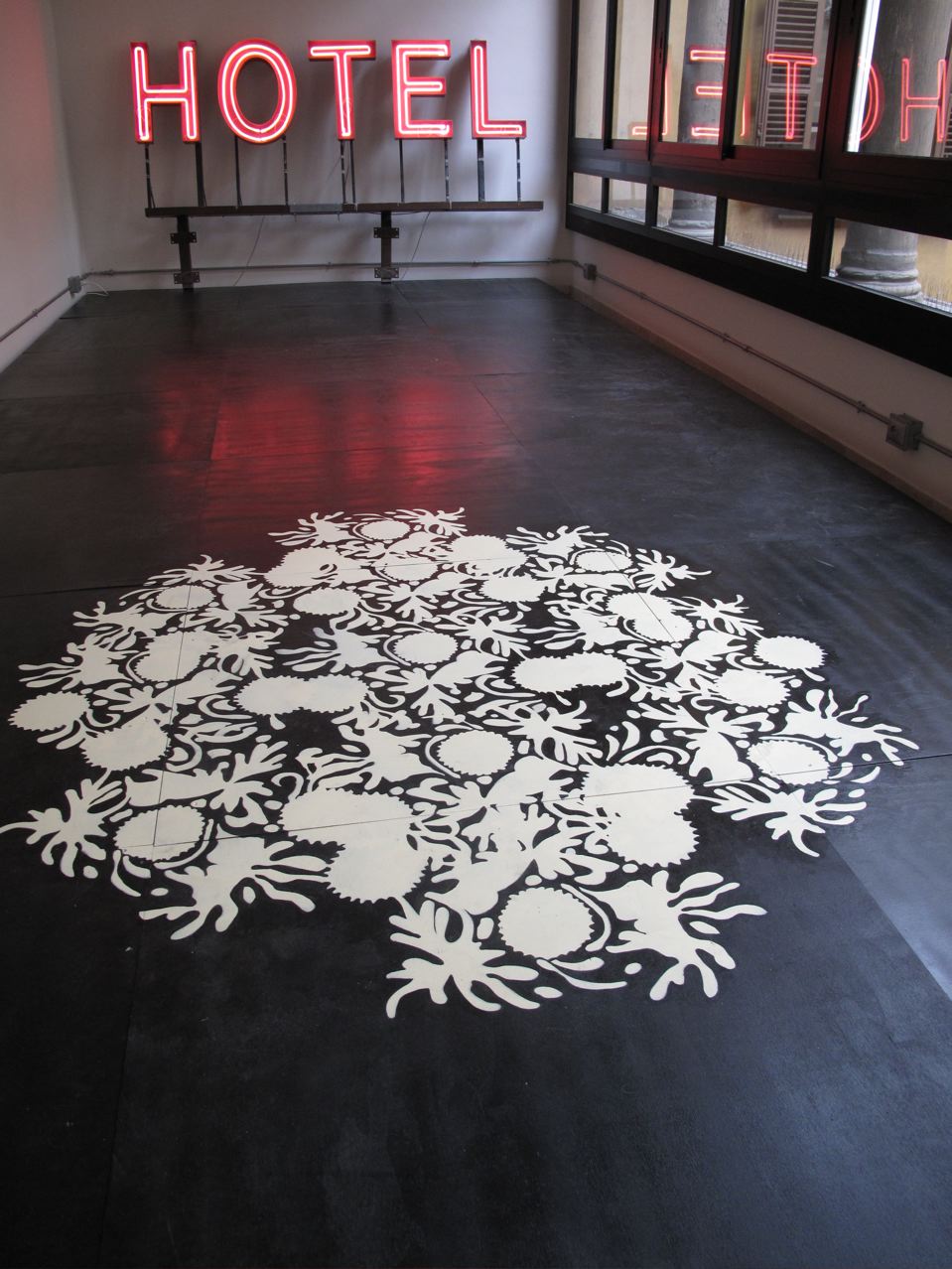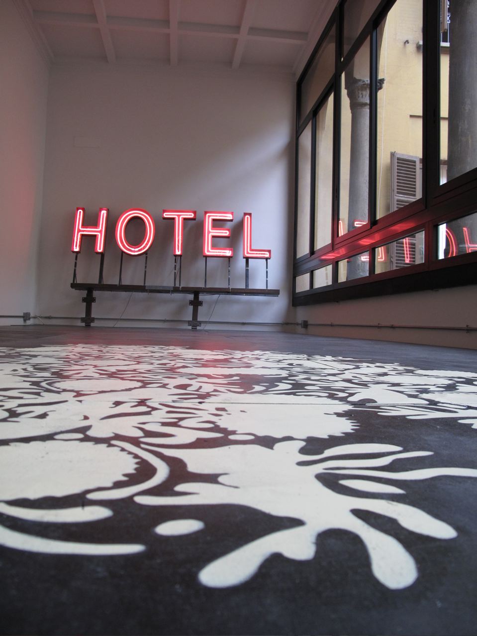 Oltre ad essere una mostra che ha a che fare con gli hotel è una mostra sui miei ricordi e sulle mie immagini rispetto agli hotel. C’è una grande insegna con neon fucsia HOTEL, c’è un pavimento rialzato nero e decorato con disegni avorio, ci sono dei miei disegni su carte intestate originali di hotel. Ho disegnato il logo El Al sulla carta del King David di Gerusalemme, amo queste immagini.