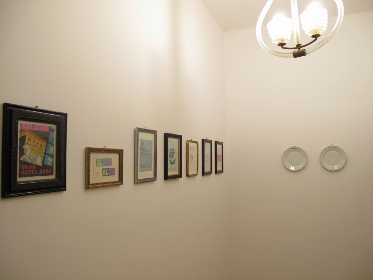Flavio Favelli: Lo spazio di Farnè è dove c’era il Grand Hotel Brun di Bologna bombardato nell’ultima guerra. Con Bologna ho un rapporto conflittuale, la famiglia di mia madre era molto bolognese, dei parenti avevano lavorato all’Hotel Brun che era uno dei primi centri commerciali di lusso. Gli hotel poi per me sono stati sempre i viaggi, quando mia madre mi portava via da casa, i set, le carte da lettere intestate, le cartoline, mi sembrava che fosse una realtà parallela, più libera, indipendente, lontana dai problemi di famiglia.
