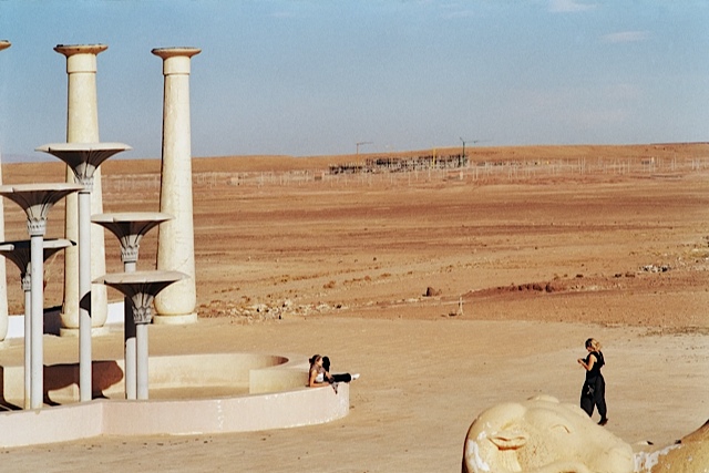 RDM: I miei paesaggi ideali sono in generale paesaggi desertici o vuoti, dove ogni elemento o persona si distinguono perfettamente e si devono confrontare con l’assenza di altre cose o persone. quasi tutti i miei lavori in video sono ambientati su delle colline di prato semplicissime, senza alberi o cespugli, possibilmente alte, con i personaggi in cima ripresi dal basso.. prati ma come se fossero deserti. spesso invece ho cercato dei veri deserti come in questi ultimi lavori sulle rovine dei set cinematografici.