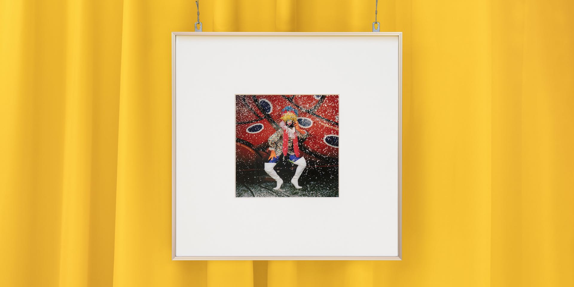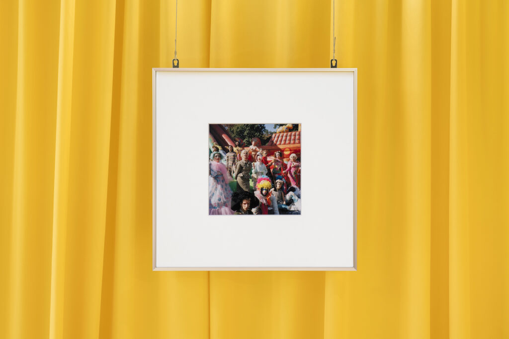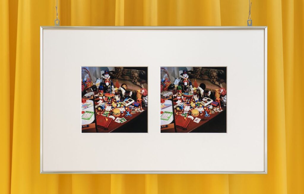 Questa tensione all’espansione si riflette anche nello spazio espositivo. La vetrina esterna prolunga la mostra in una dimensione tridimensionale: maschere, coriandoli ed elementi scenici costruiscono una composizione instabile, fatta di accumuli e rimandi – in particolare alla fotografia Trova le differenze (2023) in cui molti degli oggetti di scena riemergono in questo spazio adiacente alla galleria. Così l’immagine sembra uscire dal piano fotografico per farsi ambiente, mentre lo spazio stesso si comporta come un dispositivo visivo, una sorta di tabellone espanso. Ne deriva una struttura quasi interpretativa, una mise en abyme in cui ogni elemento rimanda a un altro possibile livello di gioco.