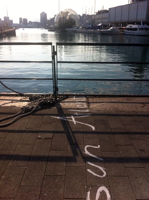 La storia, scritta da Rosa Matteucci basandosi su vicende reali svoltesi a partire dalla seconda guerra mondiale, narra della relazione tra un’ebrea di Odessa, rifugiata a Genova e un dirigente del partito fascista. Il racconto è riportato come il dialogo in tono colloquiale tra un narratore e un ascoltatore e si srotola come un lungo nastro di parole, scritte a terra con tempera bianca, che parte da Palazzo Ducale e si snoda tra le stradine in discesa del centro storico, per arrivare a gettarsi nel mare del porto antico. Un intervento d’arte nello spazio pubblico poetico e gentile, destinato anch’esso a dissolversi e perdersi nel mare. Un modo diverso di attraversare la città e di riflettere sulla relazione tra i suoi spazi e le vite che vi si svolgono.