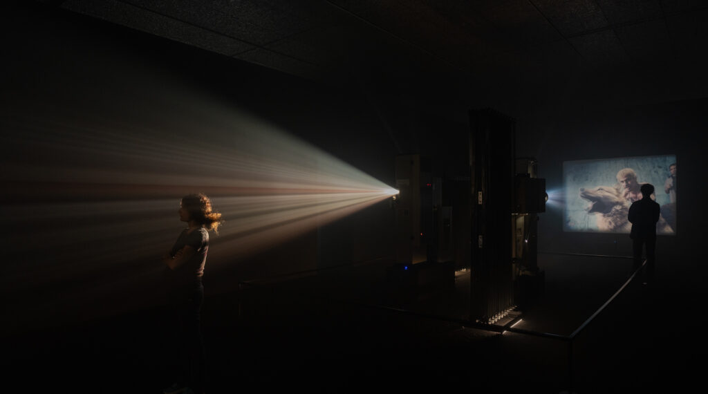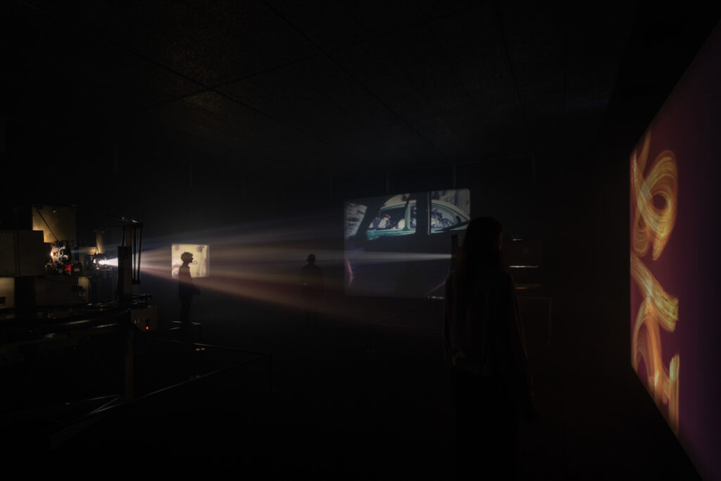 La struttura a stanze funziona come un montaggio spaziale: attraversare i bui consecutivi è come passare da una bobina all’altra, con una memoria corta che si riaccende per intonazioni, non per coordinate. L’udito diventa guida: frammenti ambientali, suoni musicali sghembi, echi di strada compongono una drammaturgia senza dialogo. Di quando in quando, è il suono – non l’immagine – a suggerire un raccordo invisibile tra sequenze lontane. È come guardare il film dal suo verso, dove il senso non precede la forma ma si coagula cammin facendo. Al centro dell’installazione c’è una profonda venerazione per la materialità del 35mm che, con la sua grana, lo sfarfallio e il calore, evoca un senso di nostalgia viscerale: il ritorno del cinema come corpo vivo.