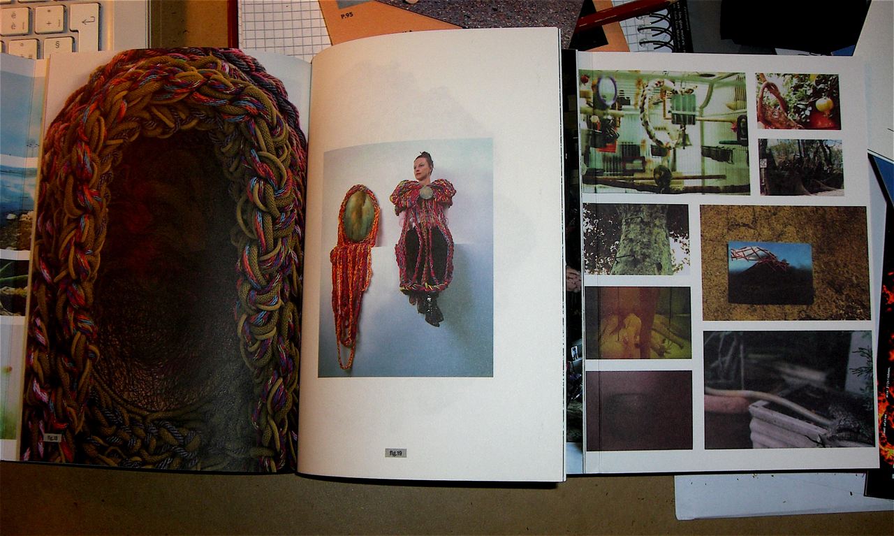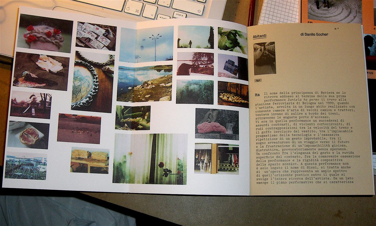 Arrivo un po’ in ritardo per la presentazione del catalogo Abitanti di Sissi. Il baretto tra via Orfeo e via de’ Coltelli è già pieno di gente. Sissi sta raccontando, con Laura Barreca, le trame e gli orditi che punteggiano la sua oramai decennale carriera. Eh sì, perché sono passati 10 anni da quando ‘Daniela ha perso il treno’ (performance alla Stazione di Bologna). Sissi, amabile e brillante, si dilunga, divaga, beve tè, mangia pasticcini… è una piacere starla ad ascoltare mentre parla della Biennale di Venezia (‘Tutti mi avevano detto di non farla’), delle sue performances, dei suoi abiti, dei suoi conflitti (pochi in realtà), del suo libro di anatomia… Ricordo parole : carne, viscere, ossa, umori, sapori, involucri, pelle…
