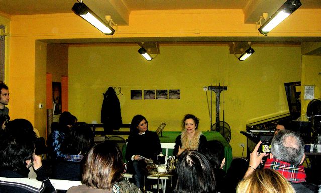 Conosco Sissi da una vita e devo dire che è riuscita a mantenere vivo quello spirito e ‘umore’ poetico che le riconosco da sempre. Tra una fetta di torta e l’uva candita, l’artista parla dei suoi diari, dei suoi progetti post-morten, delle sue delusioni e speranze, delle sue esperienze con le gallerie, di alcuni aneddoti sulla sua infanzia. Sorride e diverte o si fa seria e risponde alle domande, spesso abili, di Laura Barrecca. E’ stato veramente interessante conoscere molte cose del suo lavoro che non conoscevo. Come non restare affascinati da una così coinvolgente energia… sì, perchè Sissi ha questo raro talento di ‘stregare’ le persone. Senza contare che era bellissima con la sua pelliccetta, la sciarpa argentata/dorata, le unghie azzurre, i capelli intrecciati, gli occhi azzurri…