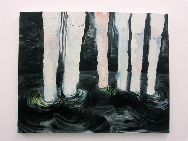 In modo molto esplicito, l’opera di Diago Hernàndez, ‘Almost Falling’ esprime la ‘sua’ tensione: una vecchia sedia sostenuti da fili di ferro, forse in procinto di cadere. L’artista rovista nell’immaginario della propaganda del regime comunista della sua terra d’origine, Cuba, per visualizzare una sua personalissima visione della tortura, dell’attesa e del potere. Anche nell’opera di Zhang Huan, la presunta tensione si manifesta nel mostrarlo (mediante una grande fotografia in bianco e nero) durante una performance nella quale si è legato al Watari Museum di Tokyo. Più sottile la tensione nell’immaginario di Lorenza Boisi. Propensa più allo scavo interiore che non a rappresentazioni verosimili della realtà, l’artista sviluppa una pittura dedita alla manifestazione introversa dell’animo umano, mostrando dettagli di scene che definirei oniriche (gambette immerse in un liquame nero e inquietante, pezzi di legno, di muro, di case che cadono…), o attriti tra scure figure geometriche (o astratte). Non narra, impressiona la tela in modo veloce e maldestro con quelle che mi piace pensare come istintive immagini oscure e rivelative.