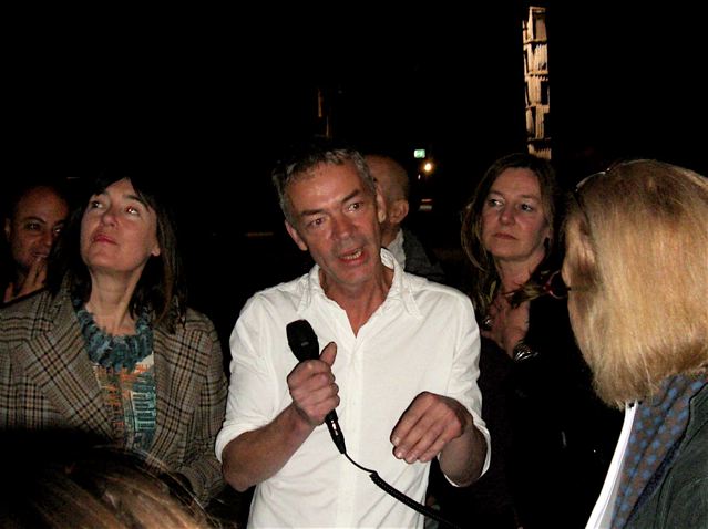 Alberto Garutti ci racconta: “Per quanto riguarda il lavoro, io non sono stato capace di ignorare – come penso in tanti facciano – questo spazio enigmatico perchè così vasto. Enigmatico per la sua ‘buiezza’ se così posso dire. Ci riporta in un’atmosfera quasi metafisica. Alla fine penso che l’arte abbia a che fare con questo: con questo grande enigma che sta sopra la nostra testa… che ha a che fare anche con la natura. Mi riferisco appunto alle Terre Vulnerabili.. anche alla ciclicità della natura. Al giorno e la notte, al freddo e al caldo, al buio e alla luce. Questa mostra contiene l’idea dinamica dell’ ‘andare verso’ del procedere, del costruire un’energia che porterà delle mutazioni. Si potrebbero dire 1000 cose. Mi piace come hanno pensato la mostra Bertola e Lissoni, per quest’idea di mostra non assertiva. Si muove nel tempo e nello spazio. Bho.. ho un sacco di cose nella testa… che vorrei dirvi ma non ve le dico!” Hahhhaaa.. è la risposta del pubblico. Mha, pensavo io. Che ammasso di …