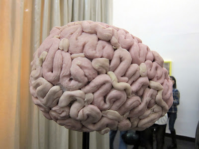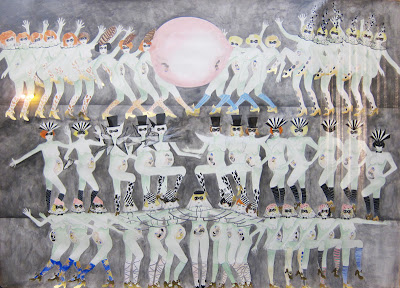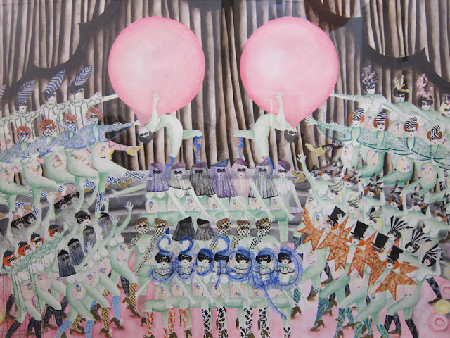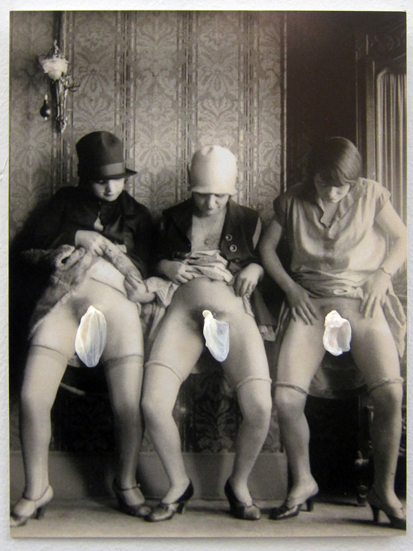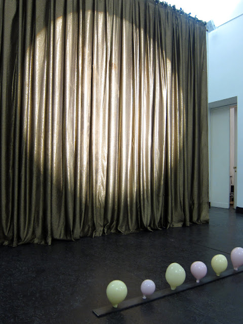 E invece l’affermazione potrebbe essere vera, o comunque la frustrazione viene esorcizzata in maniera divertente, perché l’approccio iconografico al tema del ventre materno, visto come qualcosa di estraneo, si trasforma in un’equazione decisamente irriverente: Pancia=bubble gum! Palloncini gialli e rosa evocano scenografie belle époque e spettacoli di varietà, in cui le ballerine sono tutte incinte di Junior. C’è un po’ di tutto, autoritratti vecchi e nuovi, sculture, acquerelli, video, pornografia vintage, vinili e tip-tap.
