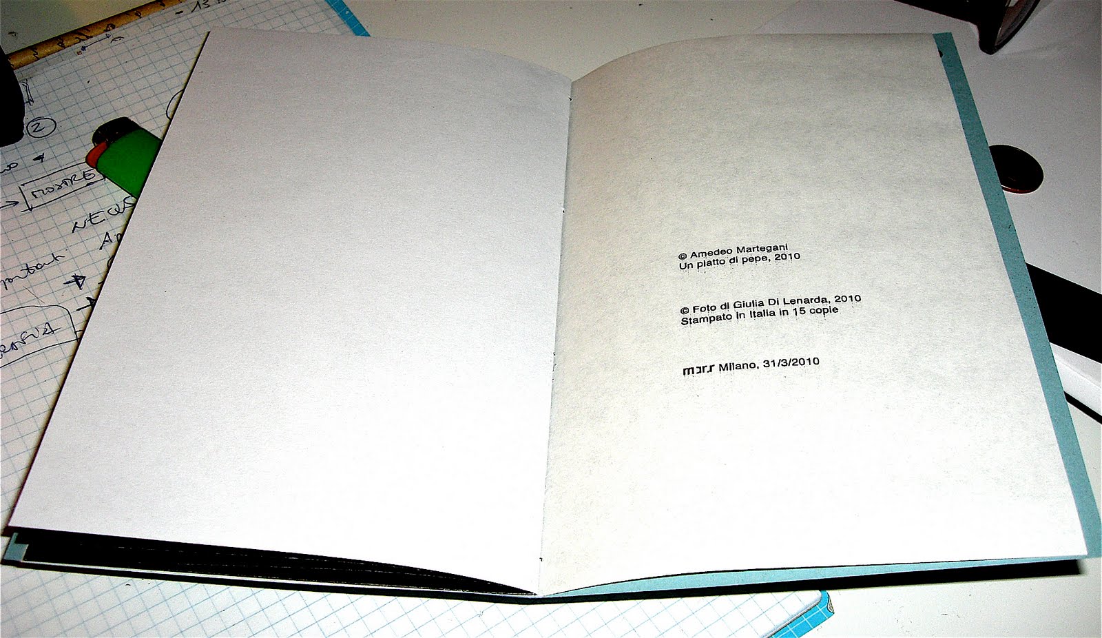 Ho il catalogo tra le mani. In effetto è un delicato libricino. Ben stampato e amorevolmente rilegato da Giulia Di Lenarda, che è poi anche l’autrice degli scatti. Il catalogo è stato stampato in 15 copie.