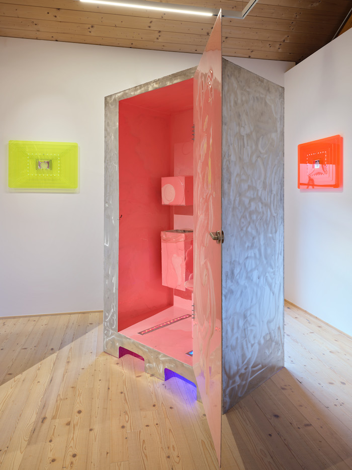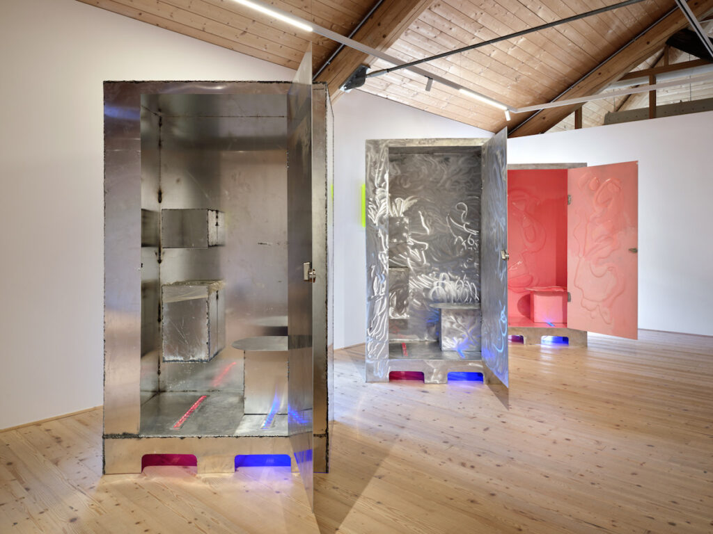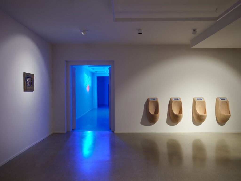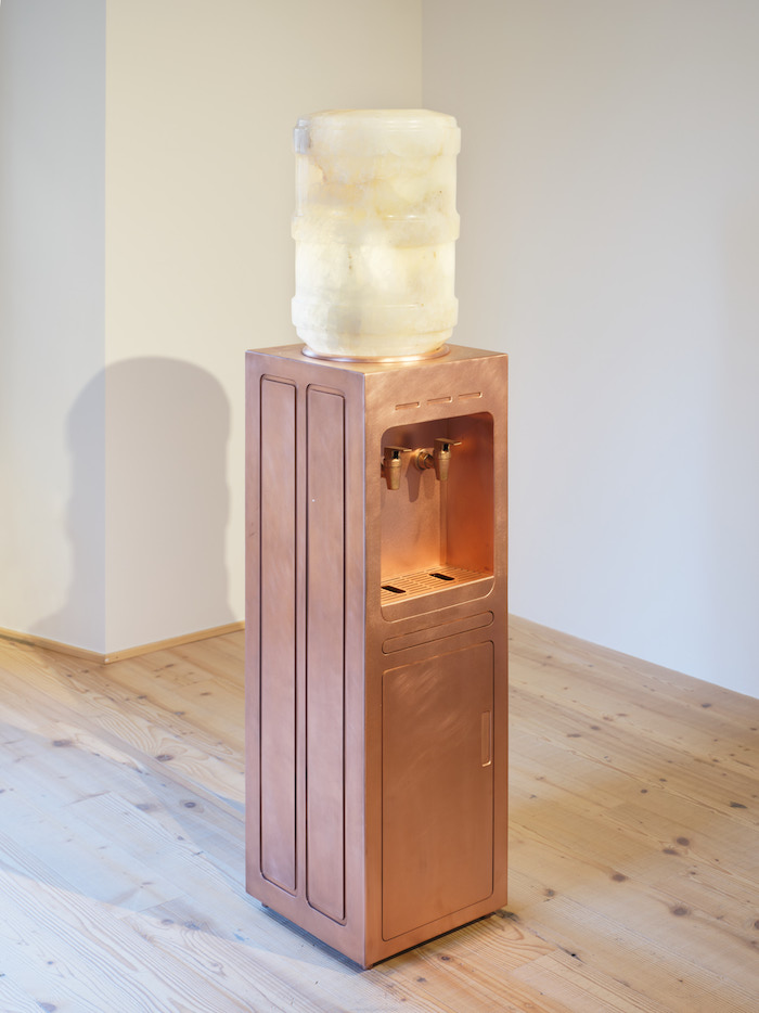 GT: Le Cabin rendono questa tensione molto chiara. Sono insieme box di carico, toilette pubbliche e spogliatoi. Costruite sul modulo del pallet internazionale, sono pensate per accogliere uno o più corpi. Anche durante la visita ci si potrebbe chiudere dentro, da soli o in compagnia. Attraverso materiali e finiture diverse, ogni cabina suggerisce una possibilità di riconoscimento e di attrazione estetica. Questo tema si precisa nel Water Cooler in bronzo. Villiam parte da un oggetto tipico dell’ufficio contemporaneo e lo tratta come un monumento, perché attorno a questi dispositivi si raccolgono gruppi, si costruiscono prossimità, si attivano inclusioni ed esclusioni. Il distributore d’acqua non serve solo a bere: organizza una pausa, una micro-scena sociale, una forma quotidiana di privilegio. Trasformarlo in bronzo significa rendere visibile la forza politica di un oggetto ordinario. Il boccione, in onice, introduce anche un’altra misura del tempo: l’acqua consumata in un giorno incontra una pietra che è sedimentazione idrica di milioni di anni. Il lavoro tiene così insieme due piani: le micro-gerarchie che si formano attorno al comfort e una temporalità profonda che relativizza l’immediatezza del bisogno e dell’efficienza. In questa frizione l’oggetto smette di essere solo funzionale e diventa una domanda su ciò a cui decidiamo di legare il nostro corpo.